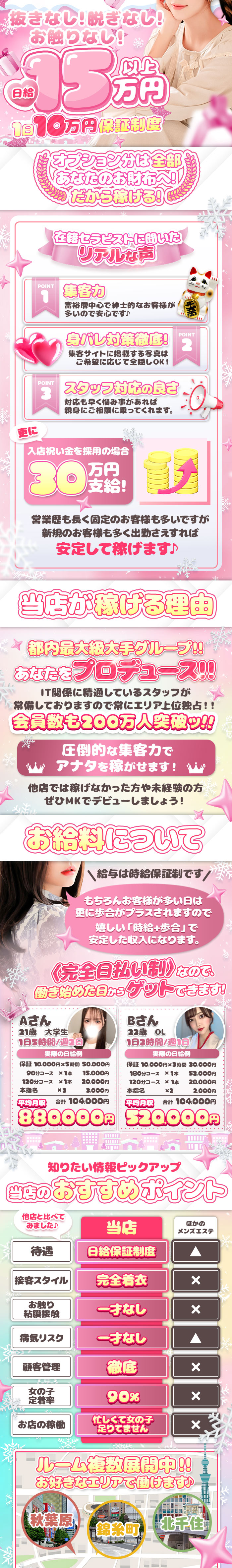 実はオープンから絶好調でして、、ルーム拡大に向けて、セラピスト様大募集中です未経験の方でも一日100000円以上可能!実際に稼いでいるセラピスト様多数ですお客様のお問い合わせに対して、セラピスト様が足りていない現状です...!1日予約が30件以上流れてしまっていますもし稼ぎたい向上心があればピッタリだと思います!大盛況につきルーム拡大の今が大チャンス!!!特に深夜帯働ける方大歓迎です築浅の高級マンションで、内装も可愛く整った設備でのびのび待機可能掃除環境も整っているので手間なく楽々掃除できちゃいますスタッフもしっかり毎日お掃除手伝います北千住で大人気メンズエステでがっつり稼いでエンジョイしちゃいましょう