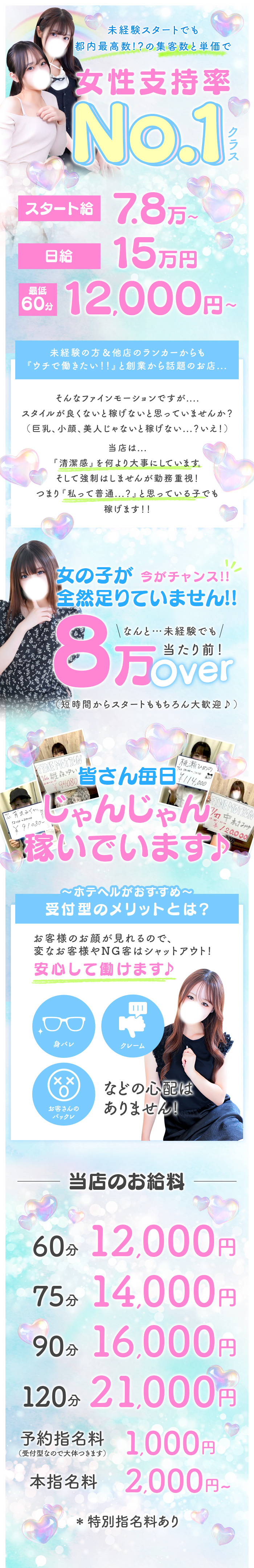 何のお仕事でもそうですがやってみない事には自分に合ってるか?お店の雰囲気は大丈夫か?働きやすいか?客層はどうなのか?など分からない部分が多数あるかと思います。勿論当店は女の子に気持ち良く働いて貰う為の環境作りには自信がありますので是非少しでも興味を持って頂けたら体験してみてください!どうぞお気軽にお問い合わせ下さい。