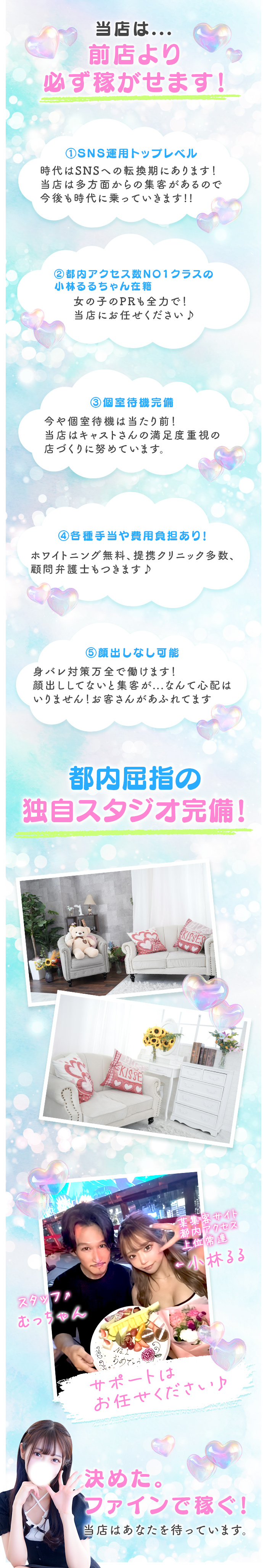 大手グループが経営しているお店だよ。待遇や条件も手厚くて安心だし、集客力もあって女の子が稼ぎやすい!待遇や条件はグループの中でも店舗ごとに変わってくるから、気になるポイントは問い合わせて聞いてみよう♪