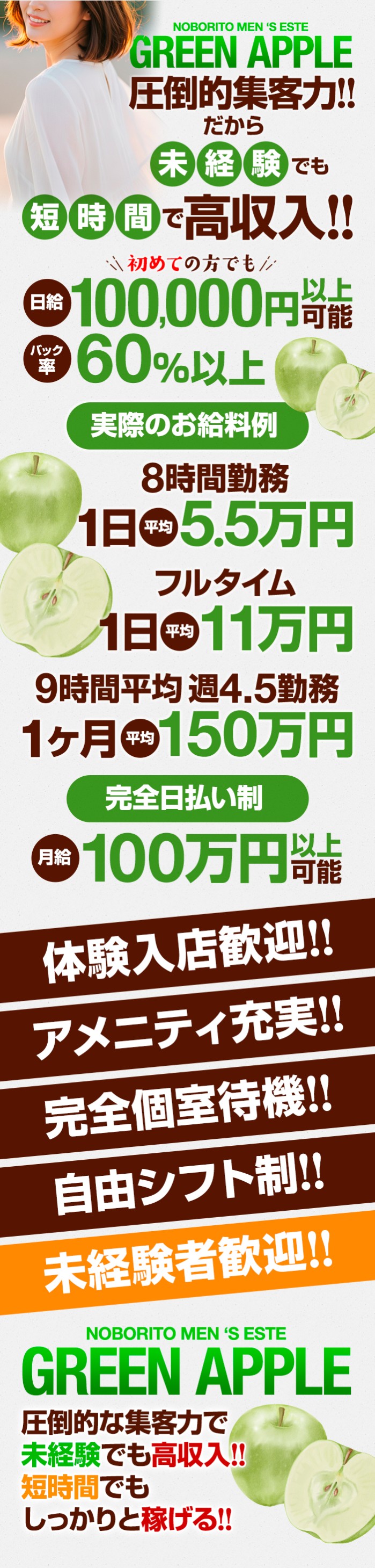 はじめまして🍏グリーンアップルの店長です😊このブログでは、お店の雰囲気や働き方、実際によくいただく質問などを、少しずつお伝えしていけたらと思っています🌿グリーンアップルでは「未経験の方でも安心して働けること」を一番大切にしています🌱実際に在籍しているセラピストさんも、ほとんどが未経験からのスタートです😊最初は不安だった方も、今では自分のペースで無理なく活躍しています✨お給料は完全日払い制💴短時間勤務でも、しっかり収入につながる環境を整えています。お部屋やアメニティにもこだわり、落ち着いてお仕事できる空間づくりを心がけています🛁✨「ちょっと話だけ聞いてみたい」「自分にもできるか不安…」そんな方も大歓迎です😊無理な勧誘などは一切ありませんので、まずはお気軽にお問い合わせください🌼📲 LINEから簡単にご相談・お問い合わせできます👉 これからもブログで、グリーンアップルのことを少しずつご紹介していきます🍏✨