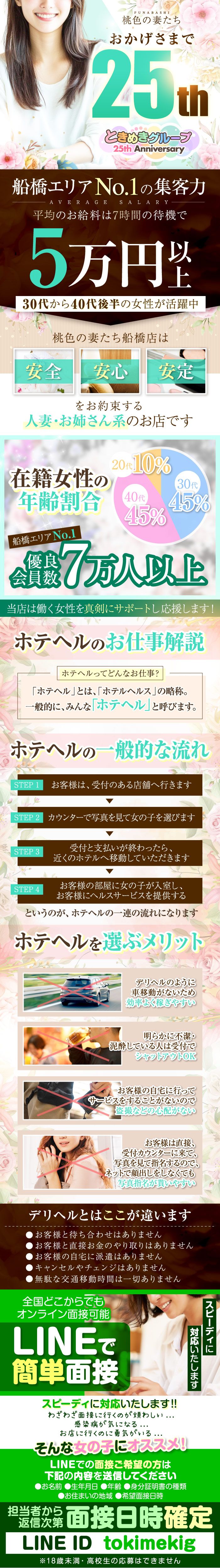 ★繁盛店だからできる超サプライズ待遇★ ときめきグループ本店『船橋ときめき女学園』が アナタの夢のお手伝いを致します。 船橋駅前の建物の1Fにお店があるからお客様が途切れないんです♪ またデリバリーヘルスと違い受付があるので 酔っぱらい客・不潔客・NG客など 当店でご案内するのにそぐわないお客様は受付でシャットアウト! 安心してお仕事ができますよ^^v でも未経験の私にできるかな・・・・? マニュアルがあるので未経験のアナタでもすぐに覚えられます。 実技講習は一切なく口頭講習になります。 グループ本店だからできる好待遇ご用意しております。