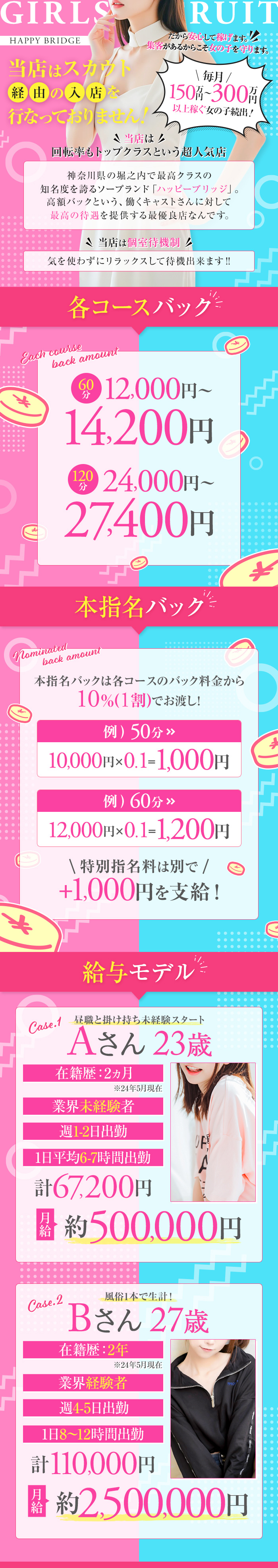 当店では、未経験の方をはじめ、主婦さん・OLさん・学生さん・掛け持ちを考えている方や出稼ぎ希望の方まで、幅広くご相談を受け付けています🌷「自分にできるかな?」という方も、まずはお気軽にお話しください😊※18歳未満(高校生を含む)のご応募はお断りしております。【お給料・待遇】各コースバック60分:12,000円~14,200円80分:16,000円~18,600円100分:20,000円~23,000円120分:24,000円~27,400円1日の平均接客数は5~12人、1回の平均接客時間は60分ほどです。※出勤状況により金額が変動する場合があります。詳しくは面接時にご説明します。