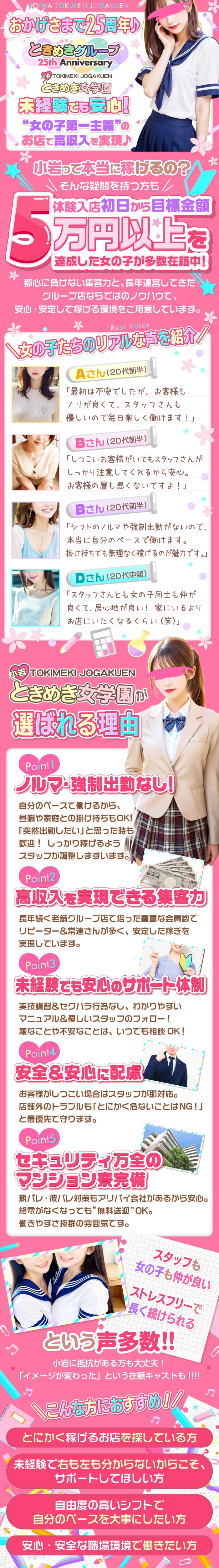 🌸「どうせ私なんて…」って、思わないで。あなたを完全バックアップします。こんにちは、ときめき女学園・求人担当です📮このページを開いてくれたあなたは、もしかしたら今こんな風に思っていませんか?「顔に自信がないから、きっと無理」「スタイル良くないし、採用されないかも…」「私なんかにできるわけがない」——でも、それ、全部あなたの“自己評価”なんです。🌟合格率、99%。だから、諦めないでください。ときめき女学園では、“あなたがあなたらしく輝くこと”を何よりも大切にしています。✔ 顔出ししなくてもOK✔ 会話が苦手でもOK✔ 人見知り、陰キャ、地味系でもOK✔ 完全未経験、大歓迎「頑張らなきゃ受からない」なんてことはありません。今のあなたで、十分です。💗「選ばれる場所」じゃなくて、「見つけてもらう場所」特別なスキルや派手な見た目は不要。むしろ、🔸ちょっと照れ屋な笑顔🔸素直にうなずくその姿🔸ゆるい空気感や不器用なところ——そんな“あなたらしさ”が、お客様にとっては最高の魅力になるんです🌷自信がなくても大丈夫。私たちが、一緒にあなたの「魅力」を見つけていきます✨💬「働きたい気持ち」だけで、じゅうぶんです。ときめき女学園は、女の子一人ひとりの事情や気持ちをとても大事にしています。🍒 週1~OK、1日2時間だけでもOK🍒 顔出し・写メ日記は完全自由🍒 掛け持ち、副業、家庭優先OK🍒 LINE・匿名相談大歓迎🍒 「見学だけ」もアリ✨面接も私服でOK、履歴書も不要。まずは「話を聞いてみたい」だけでも立派な一歩です📩🎀ときめき女学園は、あなたを【完全バック】します。 安心の女性スタッフ在籍 プライバシー徹底保護&身バレ対策万全 人間関係の悩みゼロ ノルマ・罰金なし/日払いOK 無料送迎あり/遠方からも歓迎🌸「ダメかも」って思ってる子ほど、輝ける。最初は自信がなかった子が、今では「この仕事が好きになった」と笑ってくれる。そんな瞬間を、何度も見てきました。大丈夫。あなたもきっと、“誰かの特別な存在”になれる日が来ます✨💖あなたの“ちょっとした勇気”を、全力で応援します。ときめき女学園で、新しい「私」を見つけませんか?まずはお気軽にお問い合わせください📩✨あなたとお会いできる日を楽しみにしています💖LINEからのご応募大歓迎💌ID:tokimekig