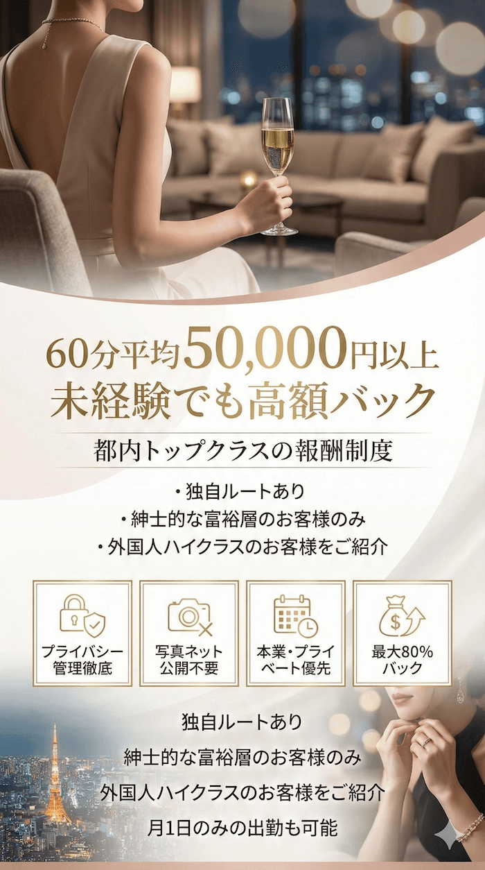✨案件により変動! 💎バック率最大80% 🌸未経験OK・高報酬♪ 👨ハイクラス外国人顧客のみご紹介。独自ルートで安定した高単価案件! ✅本業・プライベート優先の自由シフト。月1日出勤だけでもOK。