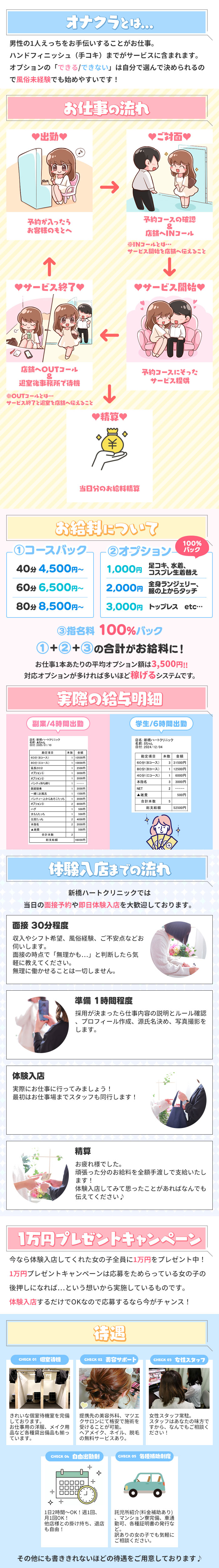 新橋ハートクリニックはオナクラのお店です。 ソフトサービスの代表格の業種ですが、実際にたくさん稼げます。 1日2~3万円、頑張る女の子で1日4万円以上稼いでいますがいかがでしょうか? もっと稼ぎたい場合は、ヘルスやソープの方が効率はいいかもしれませんね。 目標金額がそこまで高くないのであればいろいろな面で安心して働けるオナクラもありですよ♪