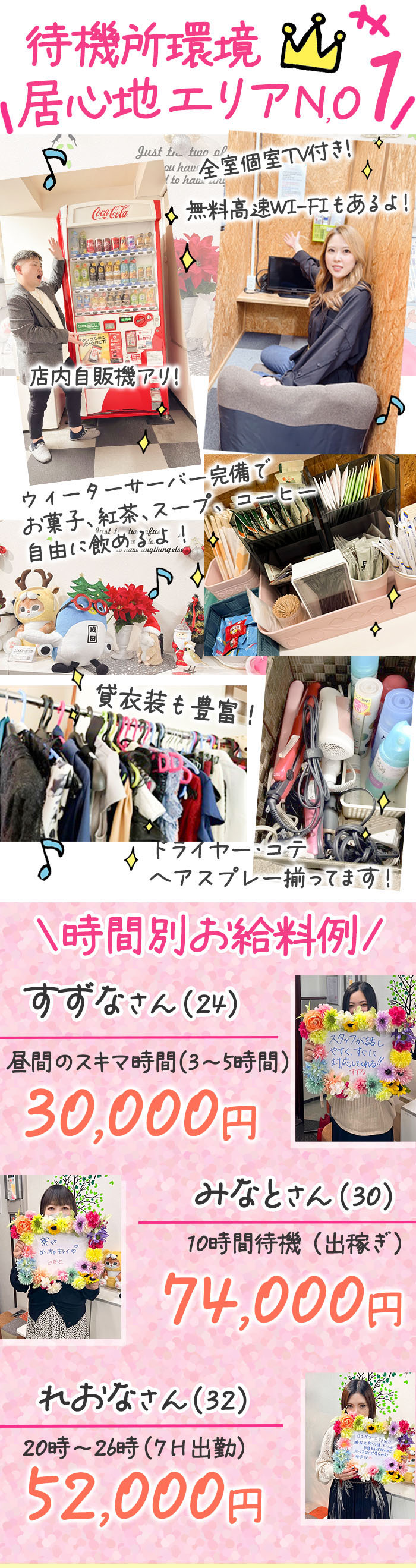 雑費は一切無料です!その変わり、ローションなどの補充はセルフ方式となります♪ お給料は完全日払い制なのでその日に現金でお渡しいたします(^^)/