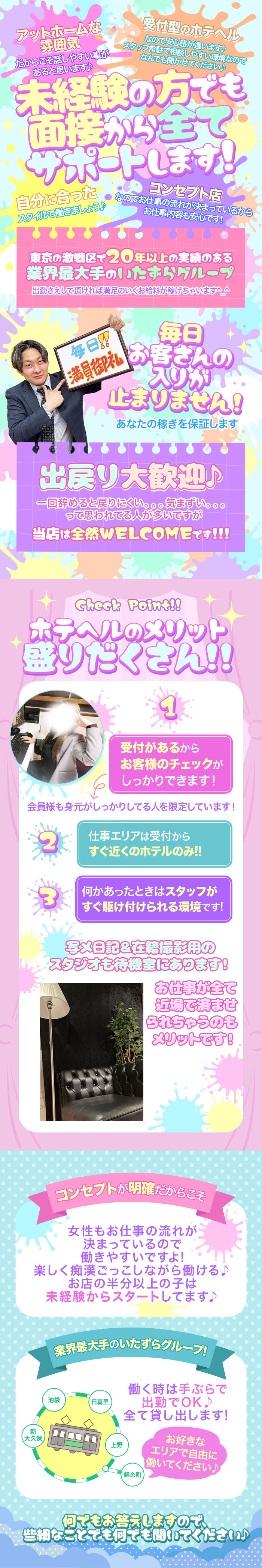 当店は都内最大級のホテヘルグループになります! 経験者の方はもちろん、未経験の方も大歓迎です! ぜひご応募お待ちしております!
