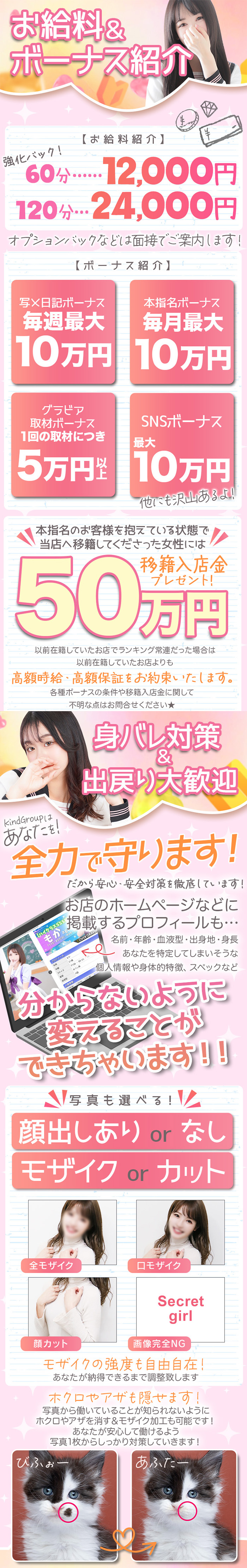 ご質問ありがとうございます! 当店では大学や本業のお仕事、家族にも内緒で働けるよう秘密厳守を徹底しています。 顔出しNGももちろんOKで、写真にはモザイク加工やスタンプを使い、身バレ対策は万全です◎ ご希望に合わせて出勤エリアの制限やSNS掲載なしなどの対応も可能ですので、安心してご相談くださいね😊 まずは気軽にお問い合わせをお待ちしています!