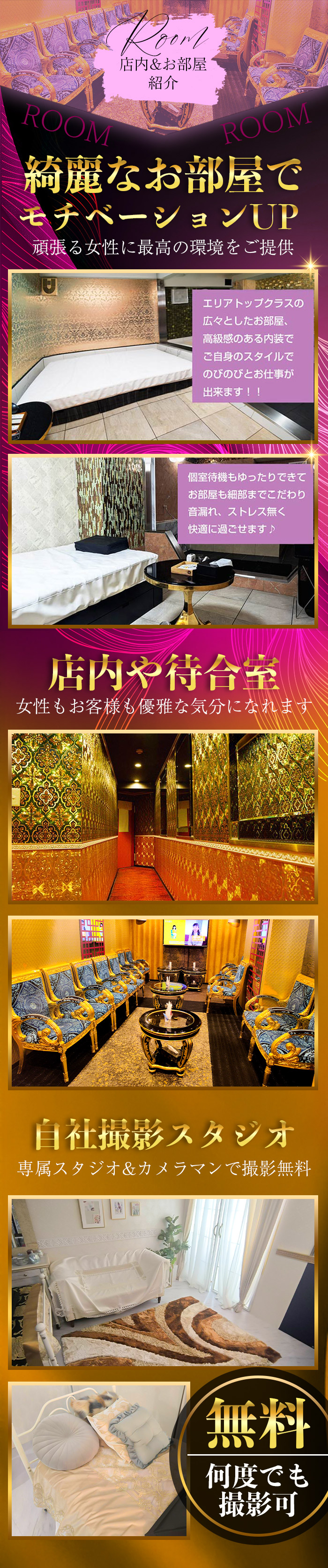 - お仕事に必要なドレス・ヒール・初回分お仕事セット、豪華自社スタジオでプロ級カメラマンによる写真撮影全て無料。