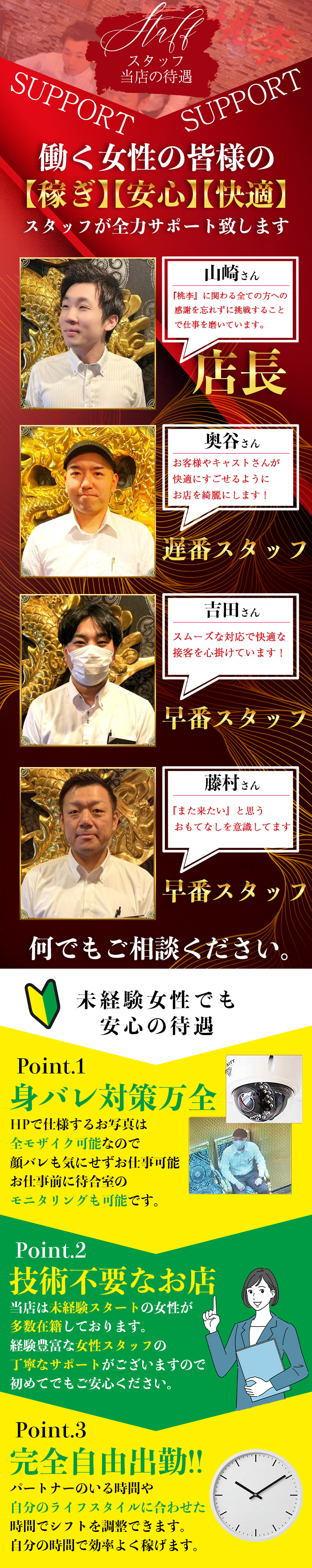桃李の求人担当香島です!当店のスタッフさんは優しい方しかいません!・他店で高圧的な対応された・セクハラ発言されたという経験がある女性も沢山いらっしゃると思います。かなりお客様対応や女性対応には気を遣っているお店ですので精鋭の優しいスタッフさんのみです!これからの時期特に稼げるシーズンになってます!移籍もまだまだ間に合います☺気軽にお問い合わせください!桃李で働く女性キャストさんの真実を赤裸々にお届け!“女の子ファースト”なスタッフさん!快適に過ごせる環境!