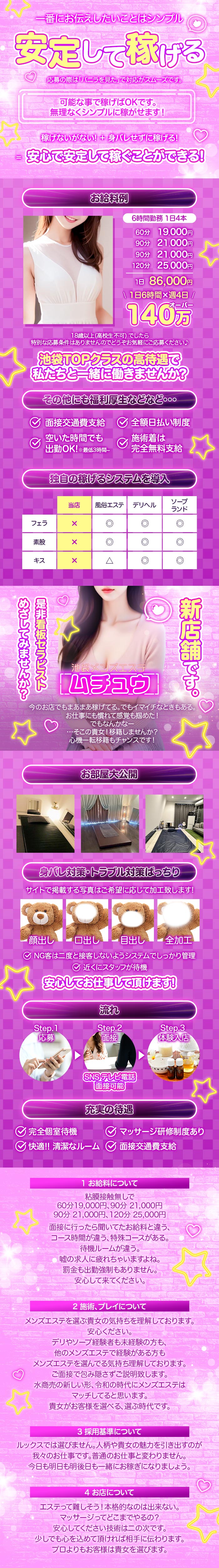 人情報ってどのくらい信用したら良いでしょうか?とのお問い合わせがあります。良く面接に行ったら求人の内容が全然違ってたという事を聞きます。当店条件面、待遇は求人記載の通りです!!うそ偽りは一切つきません!!安心、安全働きやすい当店に是非お問い合わせ下さい。お待ちしております。✨年齢20〜40歳くらいまでの女性✨未経験者大歓迎、経験者優遇✨ブランクのある方も大歓迎✨髪型、髪色自由 ネイル可能✨主婦、学生、シングルの方も大歓迎✨人を癒すのが好きな方✨頑張る気持ちのある方✨人とコミュニケーションを取るのが好きな方多分池袋で一番メンエスではギャラいいのでは?はっきり言うと風俗なんかよりも全然良いです。大公開!!60分19,000円から90分21,000円から120分25,000円から完全日払い制雑費1,000円以上は頂きません。これが池袋メンズエステ ムチュウのセラピスト様お給料です。メンズエステには、あなた自身が決められるストーリーがあります。お客様を見て、自分の意思で選び、無理なく、納得しながらお仕事ができる。自分と相談しながら、あなたらしいペースで、しっかり稼いでいきましょう。