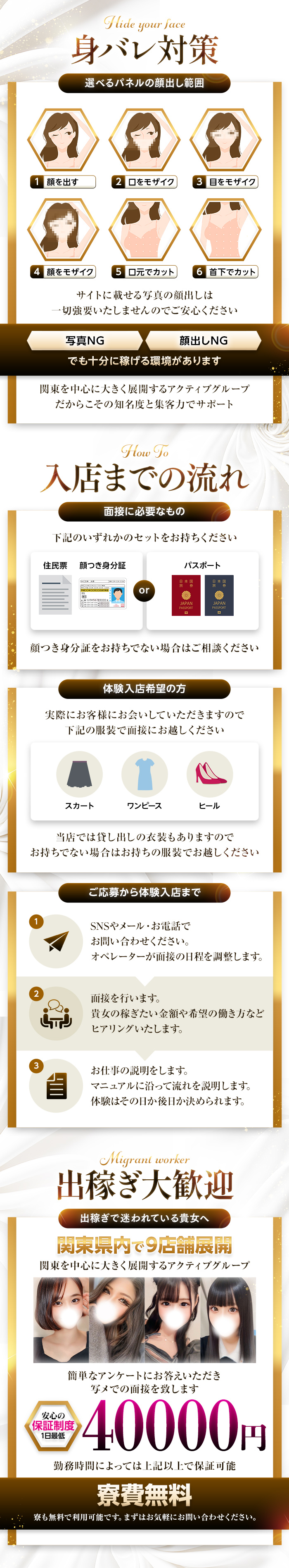 当店では「入店の強要」や「無理な引き留め」は【一切行いません】!やはり女性それぞれに働きやすい、働きづらいお店があるでしょうし、求人内容と違ったという場合もあると思います。集客力/稼げる金額は他店を圧倒していると自負しておりますので、無理やり入店をさせることもしておりませんので、安心して体入してみてください。