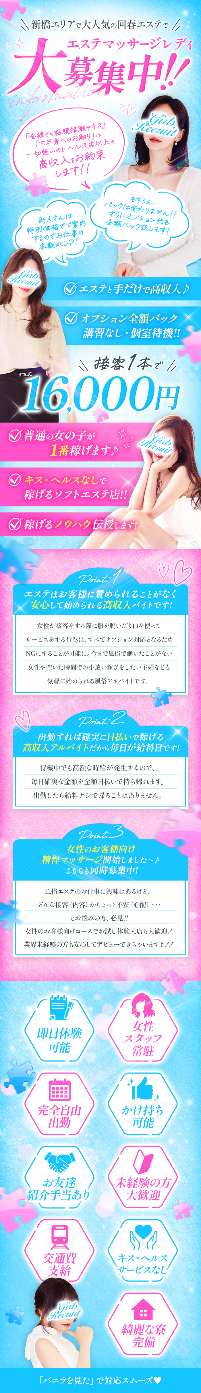 新橋は治安がよく働きやすいエリアだから未経験でも安心して働けます。客層も良くサラリーマンが多く集まるエリアとして有名な新橋で高収入をお約束いたします。未経験でも簡単ソフトなエステサービスからはじめてみましょう。また、ホテルに訪問してお仕事をしてもらうから衛生面も安心です♪