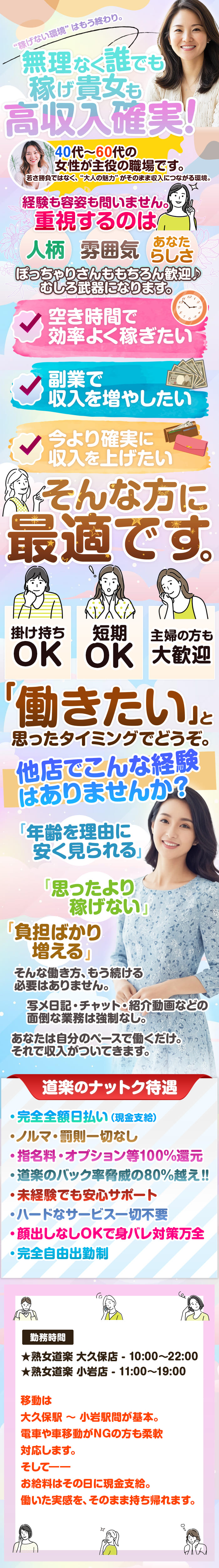 “稼げない環境”はもう終わり。無理なく誰でも稼げ貴女も高収入確実!40代~60代の女性が主役の職場です。若さ勝負ではなく、“大人の魅力”がそのまま収入につながる環境。経験も容姿も問いません。重視するのは人柄・雰囲気・あなたらしさ。ぽっちゃりさんももちろん歓迎♪むしろ武器になります。✔ 空き時間で効率よく稼ぎたい✔ 副業で収入を増やしたい✔ 今より確実に収入を上げたいそんな方に最適です。掛け持ちOK、短期OK、主婦の方も大歓迎。「働きたい」と思ったタイミングでどうぞ。他店でこんな経験はありませんか?「年齢を理由に安く見られる」「思ったより稼げない」「負担ばかり増える」そんな働き方、もう続ける必要はありません。貴女のバック60分 6,000~8,000円70分 7,000~9,000円※指名料・オプション等は全額あなたのもの写メ日記・チャット・紹介動画などの面倒な業務は強制なし。あなたは自分のペースで働くだけ。それで収入がついてきます。入店後も放置はしません。定期的なフォローで不安を即解消!“稼ぎ続けられる環境”を本気で作っています。まずは体験入店で、“本当に稼げる環境”を確認してください。【道楽のナットク待遇】・完全全額日払い(現金支給)・ノルマ・罰則一切なし・指名料・オプション等100%還元・道楽のバック率脅威の80%越え‼・未経験でも安心サポート・ハードなサービス一切不要・顔出しなしOKで身バレ対策万全・完全自由出勤制勤務時間★ 熟女道楽 大久保店 10:00~22:00★ 熟女道楽 小岩店 11:00~19:00移動は大久保駅 ~ 小岩駅間が基本。電車や車移動がNGの方も柔軟対応します。【道楽のメリット】◆ 同世代中心だから若い子が有利なんてことはありません。◆ 徹底した身バレ対策(顧客管理システム導入)◆ 内面重視の採用◆ 安定した集客力◆ 高還元で収入が伸びるスタッフは“女性の収入を上げること”を最優先にサポート。相談・要望も遠慮なく言える環境です。講習はありません。必要な方には簡単なマニュアルをご用意。無駄な拘束なく、すぐに働けます。そして――お給料はその日に現金支給。働いた実感を、そのまま持ち帰れます。初めての方は、不安や疑問がいっぱいですよね?体験入店OKですので、その後どうするか決めて下さい。わからない事は納得するまで何度も聞いて下さい。下記までお気軽にお問い合せ&ご応募下さい。「バニラ見た」とお伝えいただくと対応がスムーズです。電話/03-5937-6639(熟女道楽 大久保店)面接は「熟女道楽 大久保店」で行います小岩店希望の方は「大久保店」までの面接交通費お支払いします。※18歳未満・高校生の応募はできません。