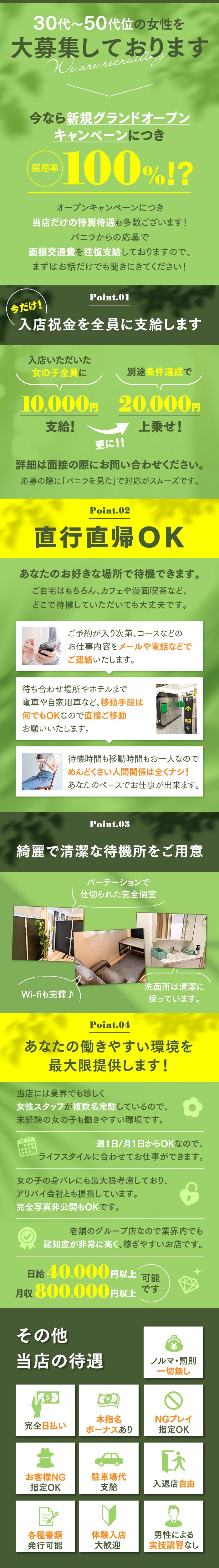 ◆男性による実技講習なし ◆直行直帰OK ◆待機場所自由 ◆女性スタッフが常駐 ◆入退店自由 ◆完全自由出勤 ◆個室待機 ◆完全日払い ◆アリバイ会社あり ◆各種書類発行可能 ◆体験入店大歓迎 ◆ボーナス制度あり ◆託児所あり ◆指名料全額バック ◆オプション料全額バック ◆短期アルバイトOK ◆出稼ぎ歓迎 ◆面接交通費全額支給 ◆出勤交通費毎回支給 ◆駐車場代支給 ◆罰金・ノルマ一切なし ◆バレ対策万全 ◆採用率120% |