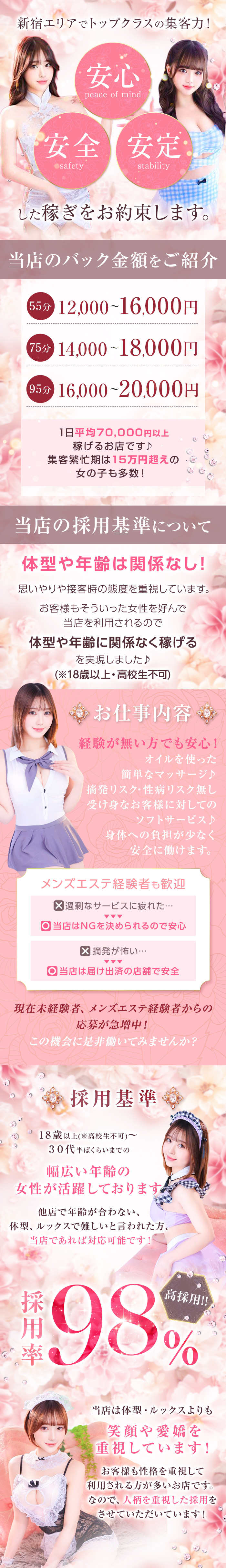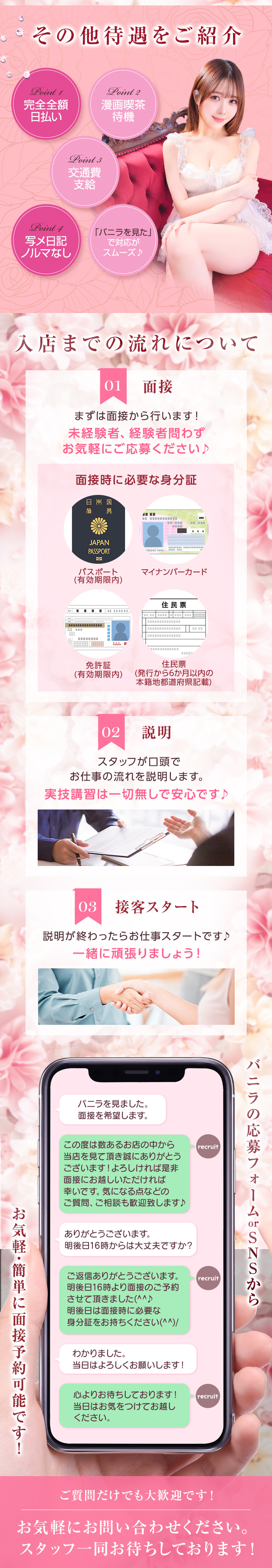 お客様用ホームページは集客効果を考えているので、一見ハードに見えますが 実はとてもソフトなサービスなんです(*^_^*) プレイ内容的に受け身なお客様が多いので、 女の子の身体の負担も少なく、無理なくお仕事ができます! しかも!!! 完全会員制で、身元のしっかりした優しいお客様ばかりなので超安心! 本当に楽しみながら楽に稼げちゃう新感覚の高収入アルバイト! 講習・マニュアルなし☆ セクハラ講習で嫌な思いをする心配もありません! 仕事の流れがわからない場合でも、理解してもらえるまで丁寧に口頭で説明します! お問い合わせお待ちしております!!