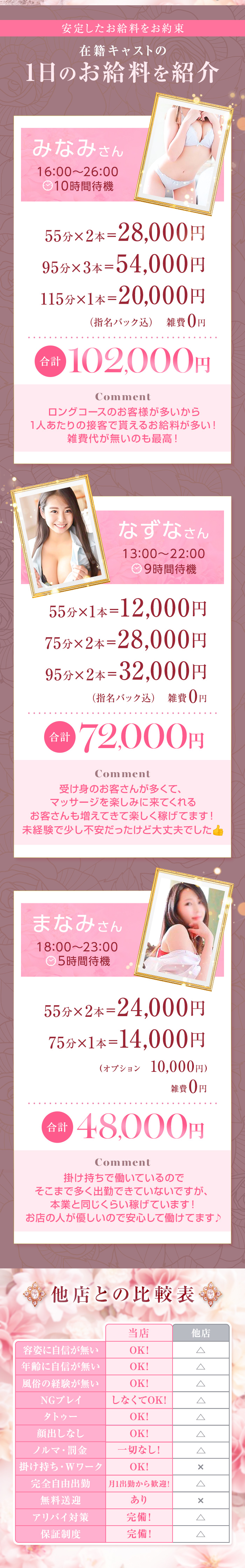 5万円以上目標 少ない出勤で月収100万 入店歴 3か月 勤務時間 6時間 初日の給与 4時間勤務で