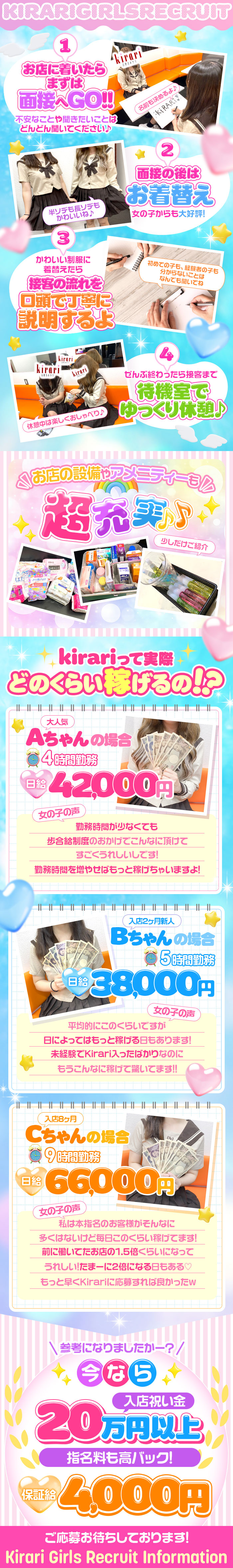 こんにちは!スタッフMです♪\2/1 kirari リニューアルOPEN/新しく生まれ変わったkirariで、一緒にスタートする女の子を大募集しています✨お店はゼロからの再スタートなので、派閥・上下関係・変なルールは一切ありません。「ナイトワークが初めてで不安…」そんな女の子でも安心して始められる環境です☺️スタッフが一つひとつ丁寧に教えるので、経験や知識はまったく必要ありません。あなたのペースで、無理なくお仕事できます。今なら入店祝い金MAX30万円支給✨このタイミングでの入店がとてもおすすめです。まずは体験入店だけでもOKなので、お気軽にご応募ください♪