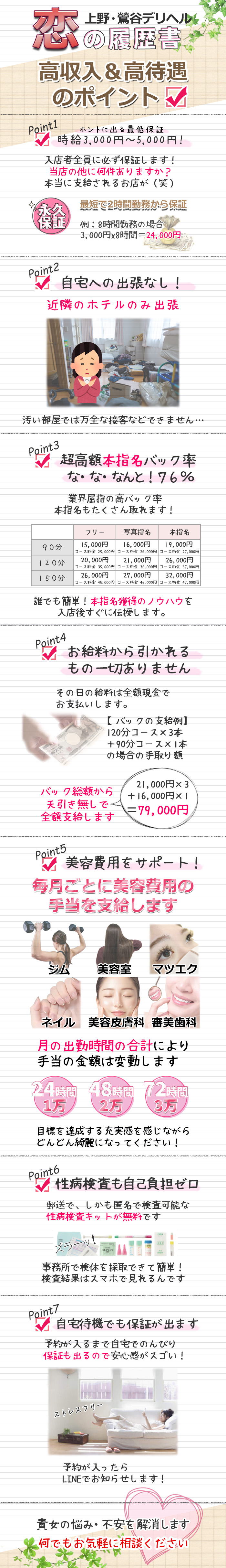 Q.最低保証はいくら?A.体験入店から1ヶ月間は最低保証【時給3,000円~5,000円】です。 Q.体験入店から1ヶ月間というのは日数ですか?それとも出勤回数ですか?A.日数となるのですが、1ヶ月間で出勤回数が15回未満の場合は、1ヶ月後も体験入店から計15回出勤するまで時給3,000円~5,000円の保証を支給します。 Q.では1ヶ月後の最低保証はどうなるの?A.本指名数などの成績により、時給1,000円~5,000円と毎月ごとに変動します。 Q.最低保証の期間は?A.在籍中は完全永久保証です。 Q.最低保証に条件はあるの?A.条件はありません。採用者全員に支給しております。 Q.最低保証も日払いで支給されるの?A.はい。支給されます。現金日払いです。 Q.最低保証+歩合給なの?A.違います(>_ 保証! KOINO RIREKISHO 恋の履歴書