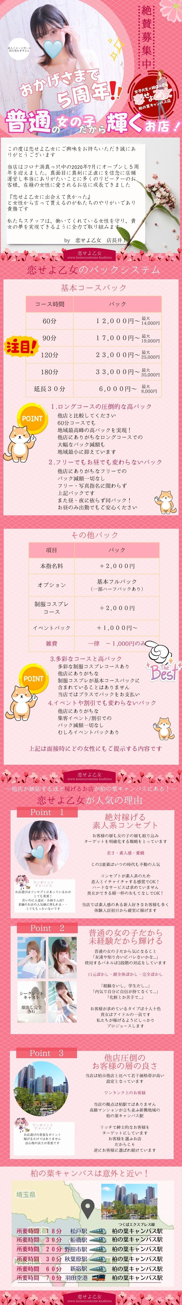 こんにちは!恋せよ乙女柏の葉キャンパス店・つくば店求人担当井上です☆★☆★☆★☆★☆★☆★当店は高バックを求人の売りにしています近隣エリアで当店より高いバックのお店はありません他店でたまにみかける面接の際になんだかんだで掲載されたバックより数千円安く提示される、そんなことは当店では一切しておらずすべての方にバニラ掲載のバックを面接時に提示しています当店で面接時に提示するバックは60分12000円90分17000円120分23000円150分28000円180分33000円当店より高いお店はないと思います当店の特徴は昼でも夜でも上記バックフリーでも写真指名でも上記バック本指名ならさらにプラス2000円コスプレ特設コースならさらにプラス2000円イメージとしてお昼14時に本指名様からコスプレコースのご利用その時のバックは60分16000円90分21000円120分27000円150分32000円180分37000円1本だけでも結構なお給料になりますといった客単価の高さが、閑散期だろうが繁忙期だろうが安定したお給料に当店で働くとなる理由ですさらに!当店は他店でたまにみかける無料オプションを作らなければいけない顔出ししなければいけないアナル系のサービスをしなくてはいけない即即系のサービスをしなくてはいけない写メ日記をたくさんあげなければいけないこうゆうのも一切ありません是非、体験入店してみてください☆★☆★☆★☆★☆★☆★恋せよ乙女ではキャスト様を絶賛募集中!稼ぎたい気持ちに稼げるまで全力サポートします!是非、お気軽にお問合せ宜しくお願い致します◇◆◇◆◇◆◇◆◇◆◇◆◇◆◇◆◇◆求人TEL 04-7114-2850LINEID otome-kashiwaメール otomekashiwa@gmail.com◇◆◇◆◇◆◇◆◇◆◇◆◇◆◇◆◇◆