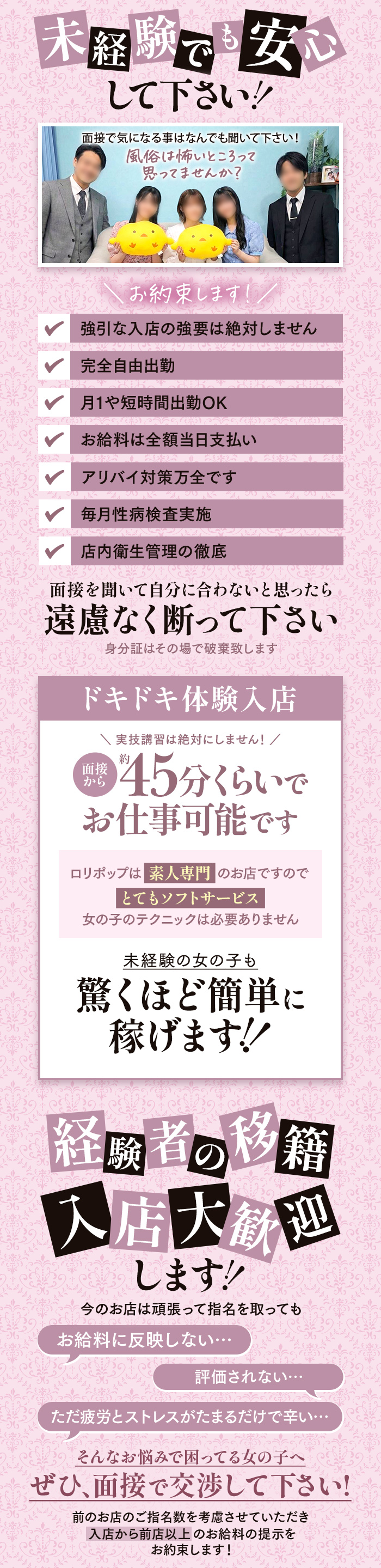 - 予定の変更がなく面接にお越しいただき体験入店をされた方!入店祝い金として最低2万円をお渡しいたします!※予定の変更・遅刻などがない方※体験入店の際は受付時間が4時間~※交通費上限は2000円