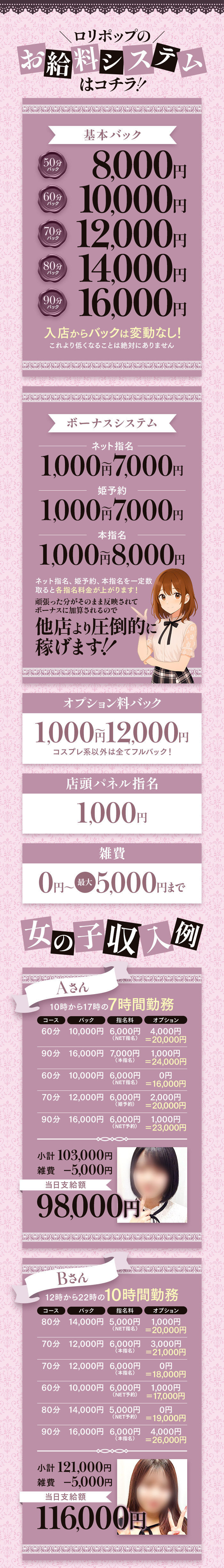 最大バック60分18000円! 50分 8,000円 60分 10,000円 70分 12,000円 80分 14,000円 90分 16,000円 ☆本指名料 コースバック料+2000円~8000円 ☆NET指名料&姫予約 コースバック料+1000円~7000円