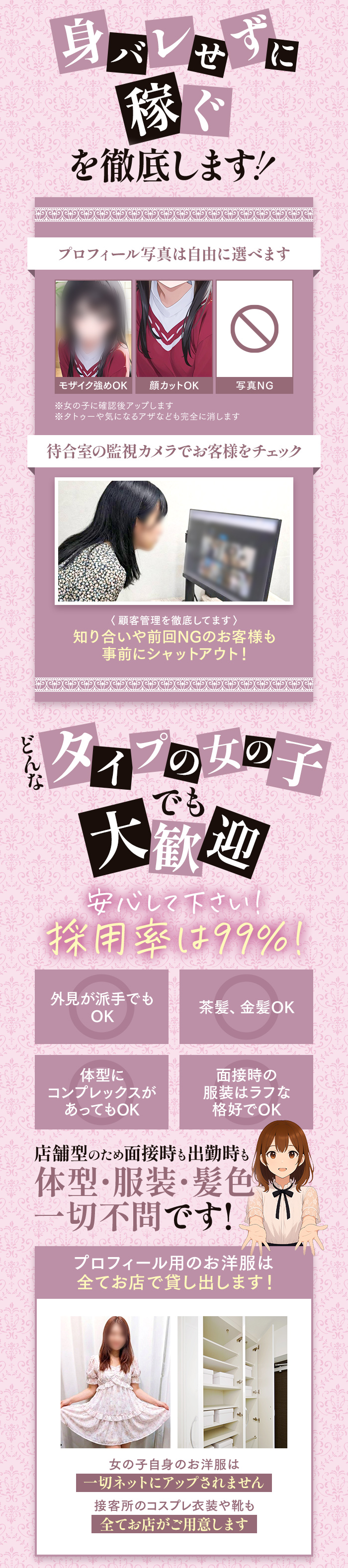 風俗のお仕事が初めての女の子も働きやすい、服を脱がずに働けるソフトサービスがメインのお店だよ。裸にならずに接客できるから安心だよね!お店によってはお仕事中の服装に決まりがあるみたいだから、アナタの希望や条件はお店に聞いてみよう♪
