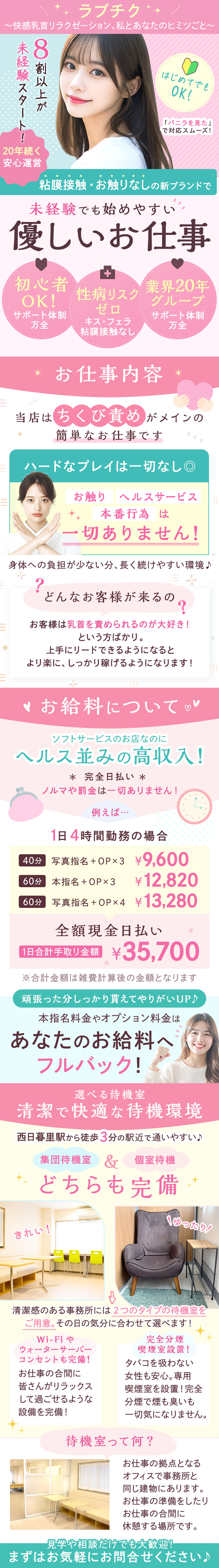 ラブチクは、乳首を中心としたソフトサービスがメインのお店です。激しいプレイや痛みを伴う責めは一切なく、“心地よさ”、“じんわりとした快感”を大切にしています。お客様から女性へのお触りはNG。見た目の激しい刺激ではなく、「感じる空気」や「距離の近さ」でドキドキを生む…そんな、大人の余裕あるプレイスタイルがお客様からも好評をいただいております。さらに、粘膜接触やヘルス行為は行わないため、性病の心配もありません。衛生面でも安心してお仕事を始めていただけます。プレイ内容はシンプルですが、【焦らす】【見つめる】【囁く】など、女性の仕草ひとつで男性がとろけていくのがこのお仕事の醍醐味ではないでしょうか(´-`).。oO「興味はあるけど少し不安…」そう感じていても大丈夫。当店は始めやすく、決して難しくはありません。貴方が長くご活躍出来るよう私をはじめ、スタッフ一同でサポートさせていただきます!