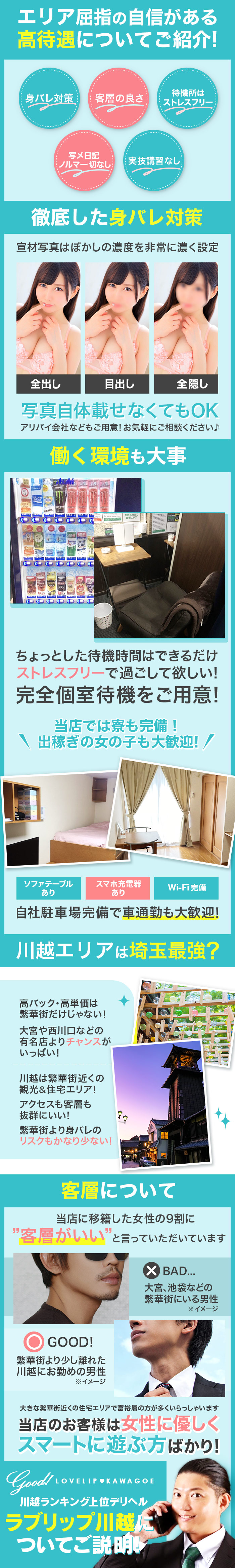 ●面接交通費支給 ●入店から1ヵ月は雑費無料 ●川越市内完全送迎 ●埼玉県内・東京都一部無料送りあり ●待機は分煙で完全個室待機 ●自社撮影スタジオ完備(写メ日記自撮りも可能) ●高額バック ●写メ日記ボーナスあり ●出稼ぎ大歓迎 ●保証制度あり ●ノルマ罰金なし ●完全自由出勤制 ●全額日払い ●アリバイ対策 ●他県での掛持OK ●生理休暇あり |