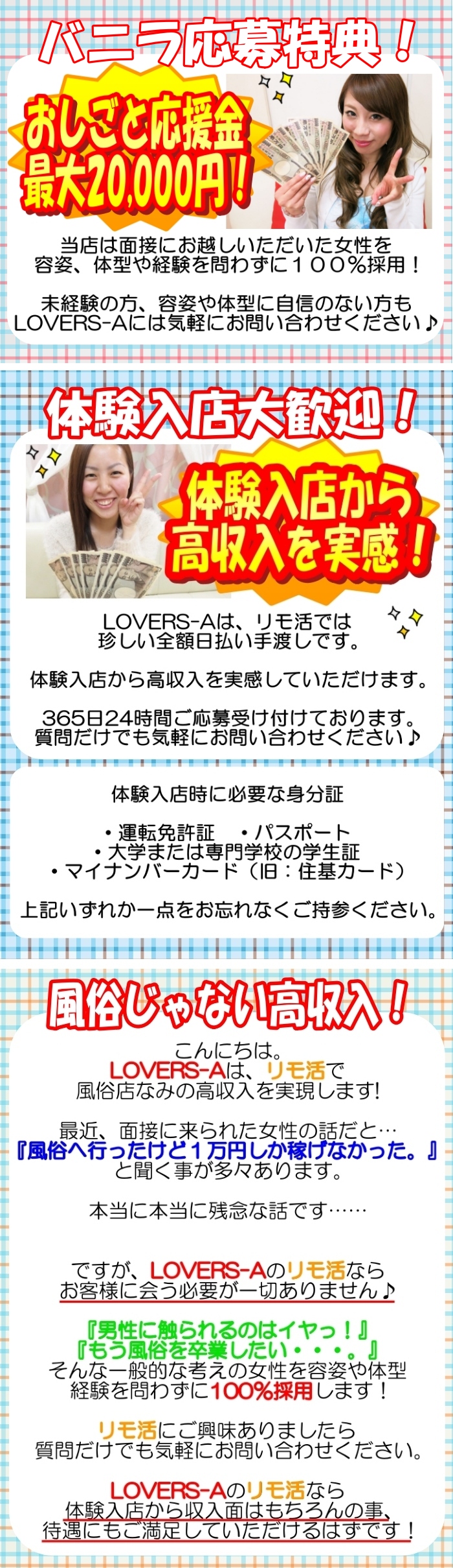 毎月苦しくってアルバイトを探してる時にLOVERS-Aを見つけてこれならできるかもって!
