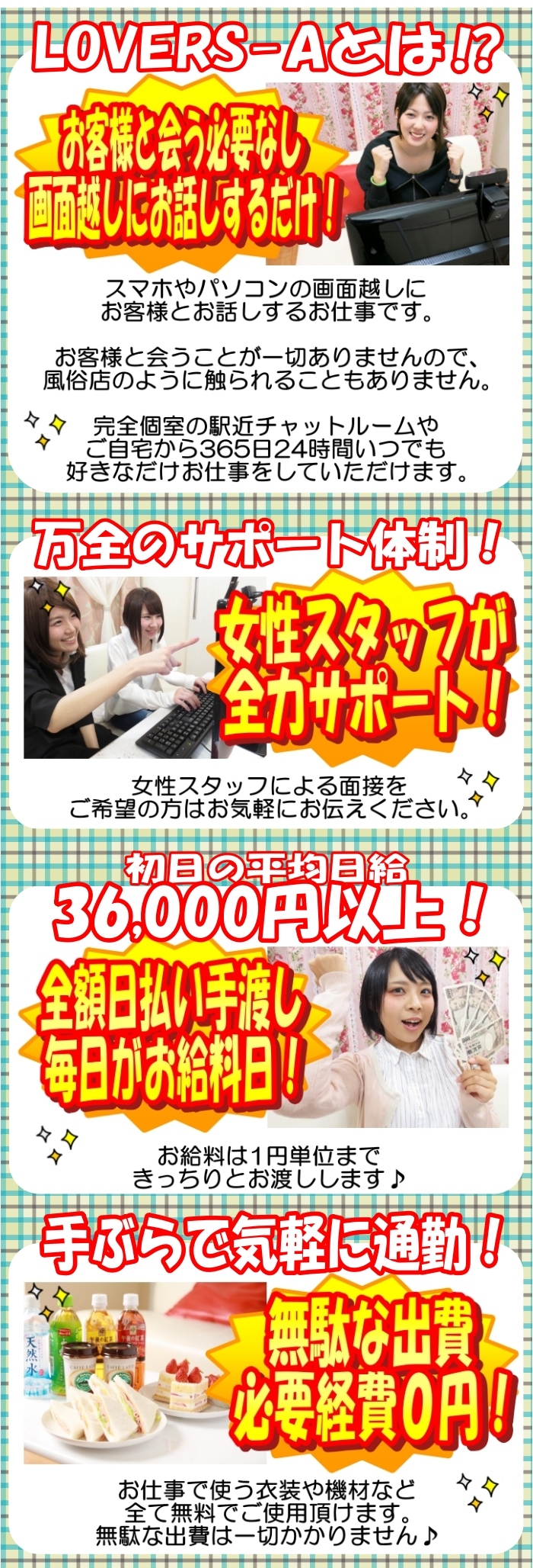 他店で稼げなかった女性にも、未経験の女性にも初日から収入、待遇にご満足していただけています! リモ活女子になるならLOVERS-Aまでお気軽にお問い合わせください☆