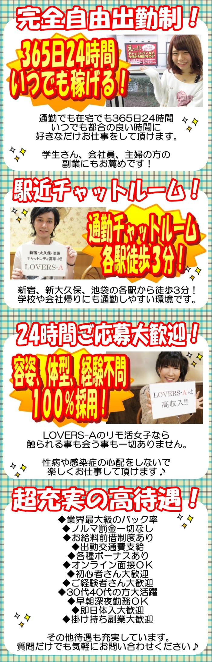 新宿、新大久保、池袋のチャットレディ求人のLOVERS-Aです。皆さんLOVERS-Aのチャットレディになってみませんか??パソコンやスマートフォンの画面を通じてお客様とコミュニケーションを取っていただくお仕事ですが、収入は初日から風俗店なみの高収入を稼いでいただけます!接客の全てが画面越し!実際にお客様と会う事も触られる事もありません♪なので、性病の心配も一切なし!!!★容姿不問!★経験不問!★面接交通費支給!★体験入店大歓迎!その他、待遇も充実しています。気軽にお問い合わせください♪【公式求人ホームページ】http://lovers-a.comWEB検索→ラバーズエー求人【LINE】http://line.naver.jp/ti/p/CBXjRzz_PaID検索→lovers-a