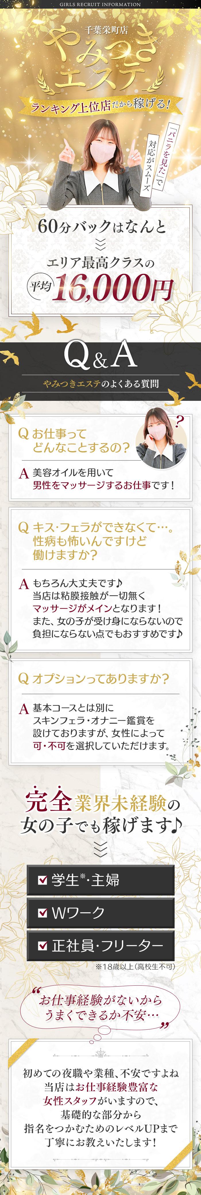 まず数あるジャンルの中で風俗エステは"華"があるお仕事です! お仕事内容は安心の【顔出しなし、キスなし、フェラなし】 粘膜接触がないので性病リスクがなく、他ジャンルとはお仕事スタイルも違います! 又、お客様も富裕層の方が多いので遊び方が綺麗で安心して働けます! 初心者・未経験の方でも、紳士的なスタッフ・女性講習員が親切・丁寧にレクチャーします。 不安な事や悩み事、ご要望など出来る限り尽力いたします! まずはお気軽にお問い合わせください!