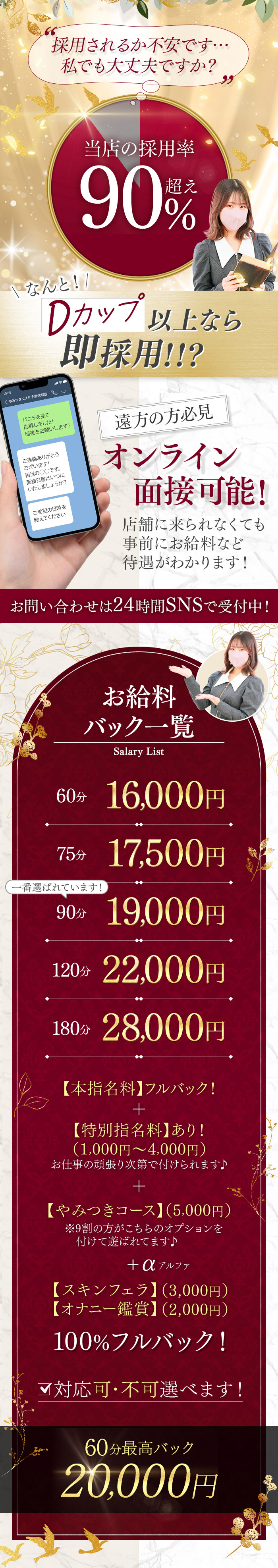 一日の待機時間などによって異なってきてしまうので、一概には言えませんが6時間で5万ほどや12時間で7万円など、清算書もHPで公開させて頂いてます! 60分のバックが最低11000円~となります! 珍しい店舗型なので移動時間などのタイムロスがなく回転率がとても良いので沢山稼いで頂けます! 他にも月に何日以上の出勤で雑費なし!や明確なスライド式バックシステムになっておりますので、頑張り次第でお給料もどんどん上がります!