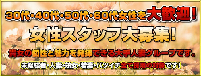 エッチ大好きな熟女さん大募集!!奥様も元奥様も独身の方でもOKです。優しく真面目な30代~60代までの女性を募集しています。(初心者の方、大歓迎!)容姿やボディラインに自信が無くても大丈夫です!★1日体験入店制度あります★完全日払い制、完全個室待機制、罰金ノルマ一切無し、アリバイ会社有り、生理休暇あり、自由出勤制・衛生管理万全・保証制度あり☆60代の女性でもお問い合わせおおいですよ。お気軽にお問い合わせ下さいね♪