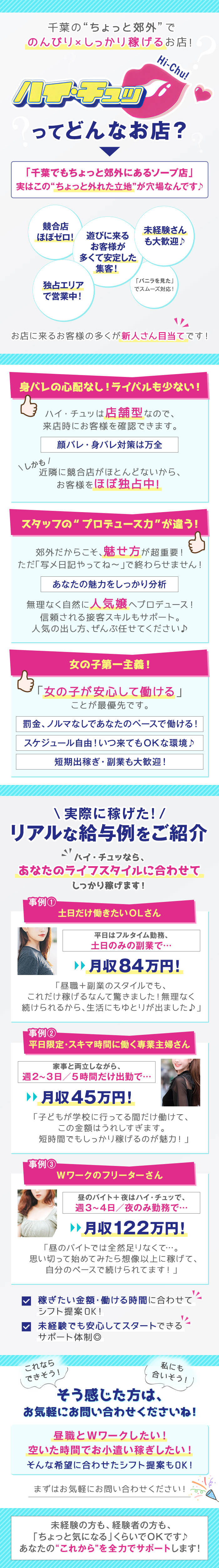 ---本日の日記---こんにちは。ハイチュッスタッフ鬼ですm(_ _)mやっぱりハイチュッのお店選びの決め手は!・個室待機・自由出勤ノルマなし・地域唯一のお店で稼げそう・大手グループの安心感・千葉県内トップの高バック率気になる方!ご質問だけでも大丈夫です。是非!お問い合わせ下さいm(_ _)m早番・遅番募集強化中こちらを見て入店した方限定!【100万円】稼ぐまで新人コース延長して面倒見ちゃいます!LINEID:hichu0202..・*・。..・*・。..・*・。..・*・。..・*・。..・*・。..・*・。..・*・。..・*・。..・*・。..・*・。..・