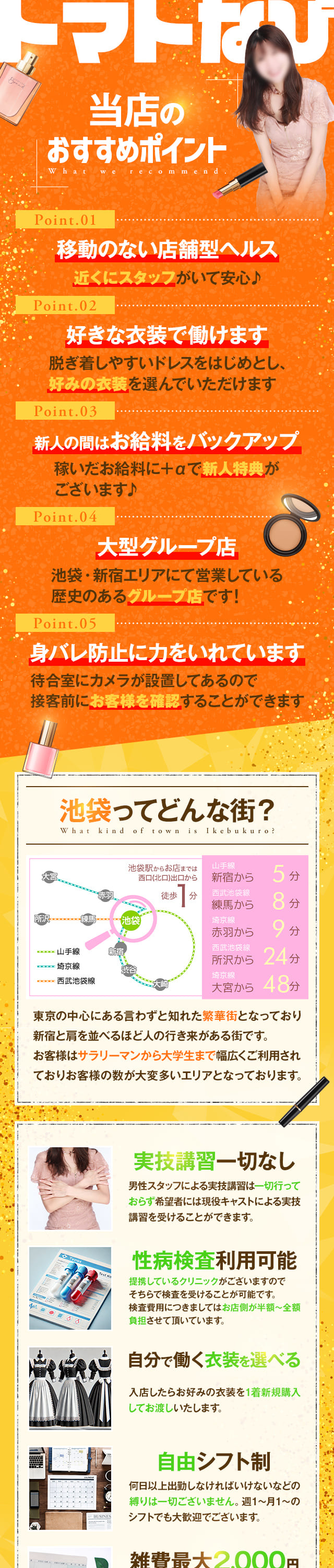 こんばんは。池袋「トマトなび」の求人担当です。お仕事を探すとき、求人情報の「時給」や「バック率」などの数字ばかりに目が行っていませんか? もちろん、入り口の数字は大切です。 しかし、実際に働き始めてから多くの方が直面するのが、「思っていたよりも手取りが少ない」という現実です。「一生懸命働いたのに、明細を見たら色々な項目で引かれていてガッカリした…」そんな悲しい思いを、あなたにはしてほしくありません。 だからこそ、トマトなびは「引かれるお金」について、包み隠さず最初にお伝えします。【「見えないコスト」をなくしました】この業界では、以下のような名目で、お給料から天引きされることが珍しくありません。・衣装レンタル代(1日500円〜1000円) ・衣装クリーニング代(1回500円〜) ・厚生費や送迎待機料などこれらが積み重なると、月に数万円の差になることもあります。 せっかくのWワーク、美容や貯金のために働いているのに、経費で消えてしまっては本末転倒ですよね。当店では、働く女性の負担を少しでも減らすため、以下の費用は「0円」に設定しています。・衣装レンタル代:無料 ・クリーニング代:無料毎回清潔な衣装を無料で貸し出しますので、自分で用意する必要も、持ち帰って洗濯する手間もありません。 手ぶらで出勤し、手ぶらで帰宅していただけます。【引かれるのは「雑費」だけです】当店でお給料から引かせていただくのは、 「雑費(最大2000円)」 これだけです。これは、タオルやアメニティ、光熱費など、お店を運営し、あなたが快適に過ごすための最低限の実費として頂戴しています。 「何に使われているか分からない謎の費用」や「後から知らされる罰金」などは一切ありません。【計算できる収入が、安心につながる】「今日はこれだけ稼げる」という計算が狂わないこと。 それは、生活の計画を立てる上でも、心の安定のためにも非常に重要です。私たちは、派手な数字で釣るようなことはしません。 その代わり、あなたが流した汗と費やした時間の対価を、最大限あなたの手元に残すことをお約束します。「結局、私の場合はいくら残るの?」 そんな具体的なシミュレーションも、面接の際にお見せできます。 お金のことも、働き方のことも、クリアにしてからスタートしましょう。 池袋で、賢く堅実に稼ぎたいあなたをお待ちしております。