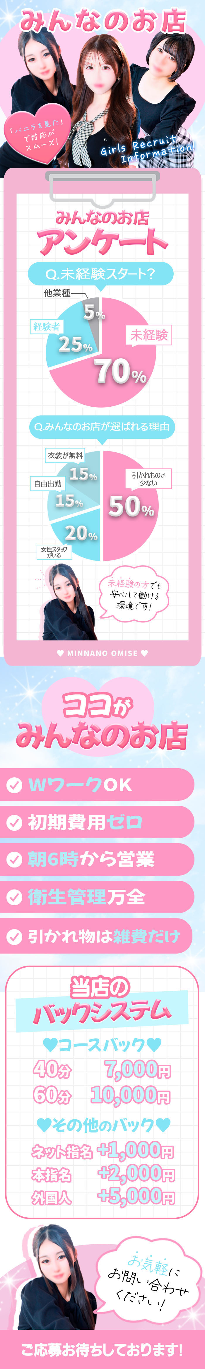 💖「タイパ最強」ってこういうこと!難しいこと一切ナシでサクッと稼ごう✨こんにちは!「みんなのお店」の採用担当です😊「稼ぎたいけど、難しいテクニックとか覚えるのは無理…」「せっかく出勤したのに暇で稼げないのは嫌!」そんな、時間も労力もムダにしたくないあなたへ。リニューアルした当店が、【一番賢い稼ぎ方】の裏側を全部教えちゃいます🚀💡「みんなのお店」が超稼げる理由と安心のヒミツ① エリア最安クラスでお客様殺到=待機ゼロ!💰「なんでそんなに稼げるの?」その理由は圧倒的な回転率にあります。お客様が遊びやすい料金だから、毎日大盛況!女の子のバックはエリア同等水準のまま、次々とお仕事に入れるから、短い時間で信じられないくらいの手取りになります。② 難しい技術は一切不要!誰でもできる簡単ワーク🔰「回転率が良いってことは、すごく頑張らなきゃいけないの?」…いいえ、逆です!当店のお仕事は【難しい技術・テクニックは一切不要】。マニュアル通りに対応するだけでOKなので、未経験でもその日からプロと同じように稼げます。プレッシャーはゼロです✨③ 引かれ物のルールが超クリア!&今だけ完全無料🎁よくある「謎の天引き」は一切しません!当店の雑費は【1本1,000円/上限4,000円】と超明朗会計。さらに!オープン特典として【3月末まで雑費が完全無料】です🎉 本来引かれるはずのお金も、今ならぜーんぶあなたのポケットに入ります!即日全額日払いで、帰りにお買い物に行けちゃいますよ🛍️④ 「元キャスト」の女性スタッフがずっと味方です🌸「忙しすぎて疲れないかな…」という心配もご無用!お店には【キャスト経験のある女性スタッフ】が常駐しています。現場の辛さも、女の子の悩みも痛いほど分かる先輩が、「無理してない?」「ちょっと休憩しようか」としっかりサポート。男性スタッフには言えない愚痴も、更衣室でいつでも聞きますよ💖「移動なしの店舗型。安心の環境で、頑張った分だけ全部自分のもの!」週1回のWワークから、がっつりレギュラーまで大歓迎!「ちょっと気になるかも…」と思ったら、まずはお話だけでも聞いてみませんか?無理な勧誘は絶対にしません。あなたの「今より良い生活がしたい!」という目標、私たちが全力でサポートします✨