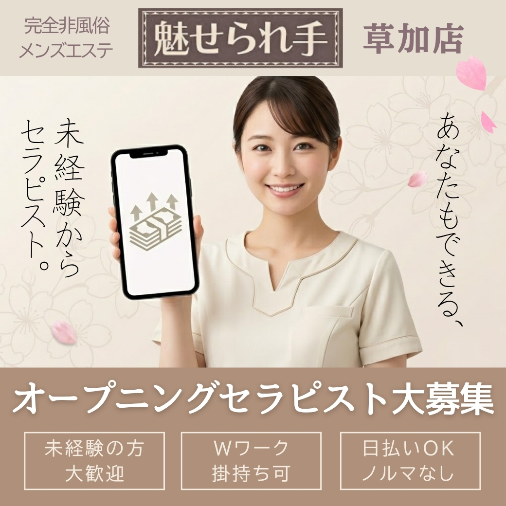 こんにちは!『魅せられ手』草加店です🌸今月3月オープンの新店で、セラピストさん募集中です!メンズエステが初めてでも大丈夫。当店は完全非風俗のリラクゼーションサロンです🌿お洋服を着たままの健全施術で、安心してお仕事できます。✨魅せられ手のポイント完全健全店:セクシー衣装や過激サービスなし!未経験歓迎:基礎から優しくサポートします😊シフト自由:好きな時間・曜日で働けます人間関係なし:みんな同期の新店でストレスゼロ✨「まずは話だけ」「お店の見学」も大歓迎です!貴女にお会いできるのを楽しみにしています😊📞 048-954-9496