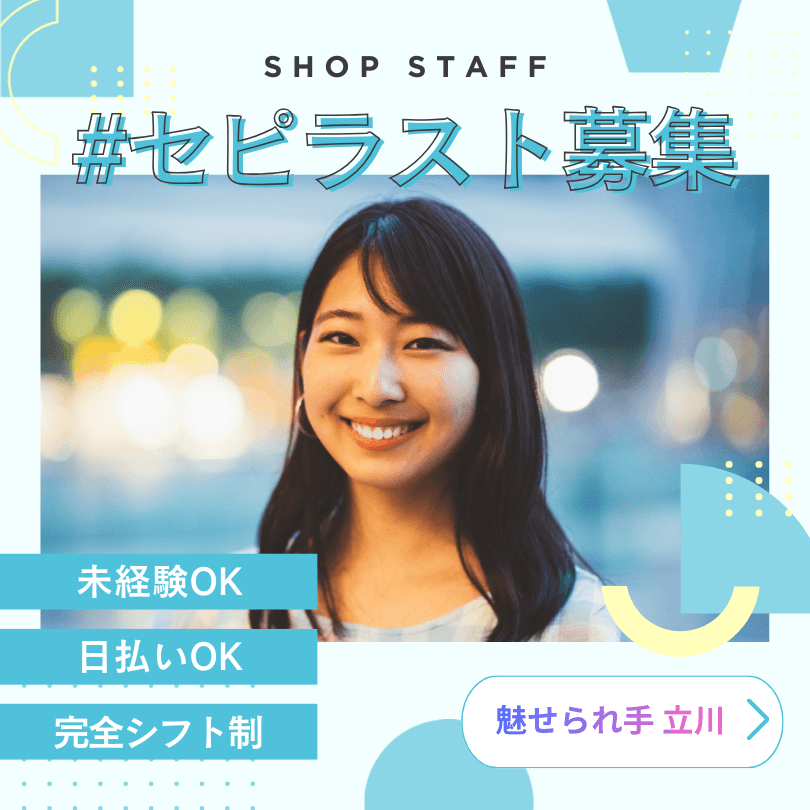 魅せられ手立川ではまだまだ新しいセラピストさんを大募集中です😊貴女はそのままで充分魅力的な方です。まずはその事に気付いていただきひとりひとりの強みを最大限活かして施術に集中していける環境全力でバックアップし提案させて頂きます。初心者の方も安心。当店の熟練のセラピストさんが直接指導します。経験のある方も他店で伸び悩んでいる方当店に来て大化けする事も実際にあります♪まずはお話だけでも大丈夫です少しだけ貴重なお時間を僕に下さい。よろしくお願いいたします。