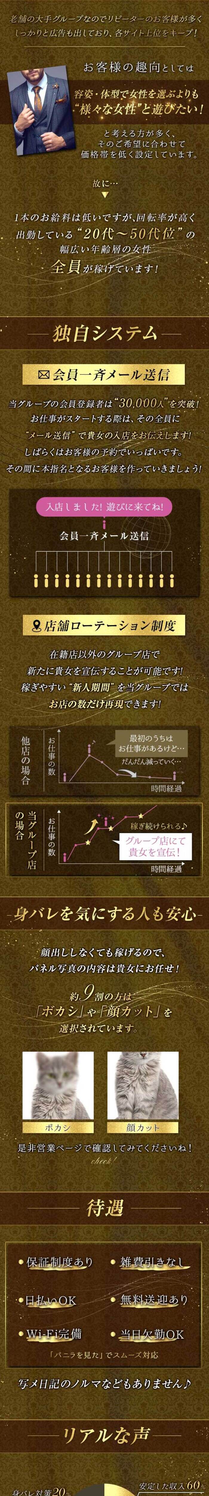大手グループが経営しているお店だよ。待遇や条件も手厚くて安心だし、集客力もあって女の子が稼ぎやすい!待遇や条件はグループの中でも店舗ごとに変わってくるから、気になるポイントは問い合わせて聞いてみよう♪
