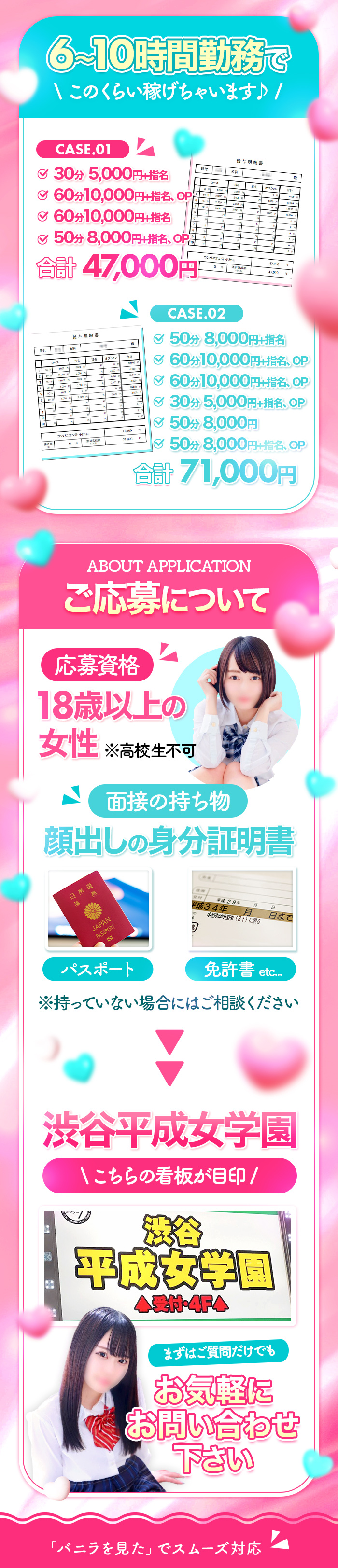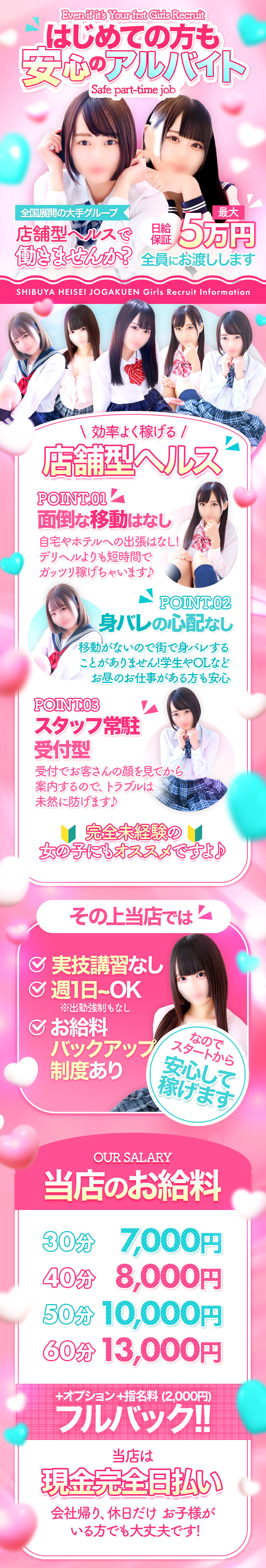 当日に体験入店をお考えの女の子の場合は、未経験の女の子ですとお仕事の内容がお分かりにならない不安などがあるかと思いますので、口頭でお仕事の手順や内容をご説明させて頂いております!