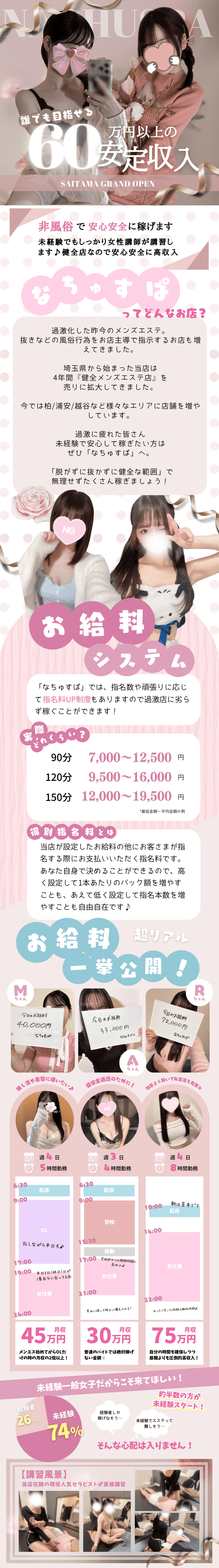 なちゅすぱには、いろいろな理由で働いている女の子がいます🌸・推し活を全力で楽しみたい!・もっと可愛くなりたくて、美容代・整形代を稼ぎたい✨・家庭の事情で自由なお金が必要…・物欲が強くて欲しいものが尽きない🛍・今のお仕事だけじゃ給料が足りない…などなど、本当に理由はさまざまです。「いまの給料に月10万円くらいプラスで欲しい」「週1だけ働いて月5〜10万円くらい増えたら助かる」そんな女の子が多いです☺️⸻【うちは“完全健全店”です】風俗サービスは一切なし・ノータッチ。未経験の子でも安心して働けるように、他店にはない 女性講師 がマンツーマンで接客を教えます💆♀️✨いやなこと・無理なことは一切なし なので、心配いりません🙆♀️⸻【柏で働くならここがオススメ】・ルームの綺麗さ、清潔感◎・防犯カメラやオートロック完備でセキュリティも安心🔐・働き方の自由度が高く、週1〜OK・Wワーク・学生・フリーター・主婦さんも活躍中安心して長く働ける環境を整えています✨少しでも気になったら、気軽にLINEで質問くださいね!見学だけでも大歓迎です😊💐