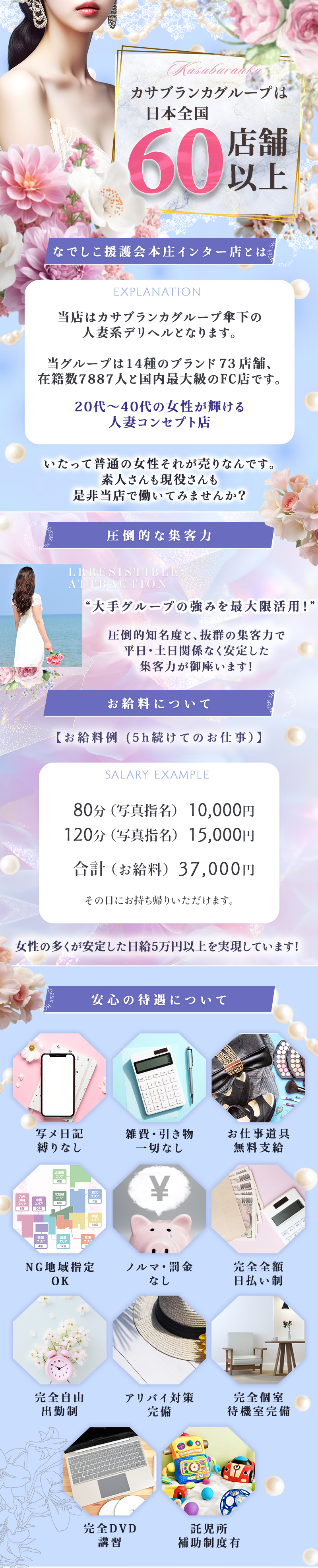 【お給料(例)(5h続けてのお仕事)】 ■80分(写真指名) 10000円 ■120分(写真指名)15000円 ■合計(お給料) 37000円 その日にお持ち帰りいただけます。