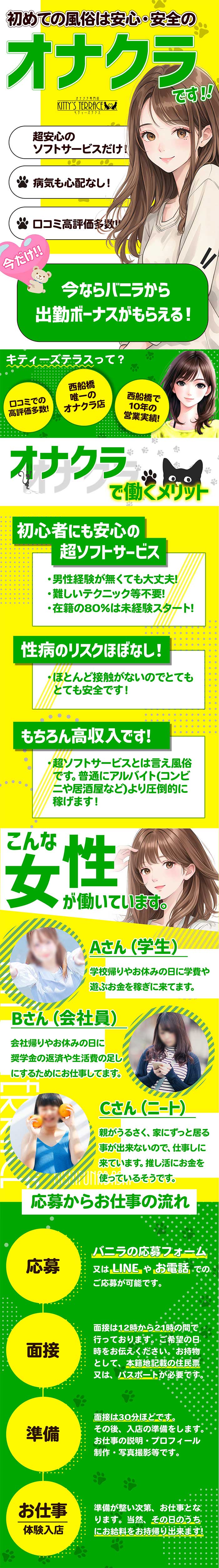 こんにちは!「キティーズテラス 西船橋」です🐰今日はよくいただくご質問、「どうしてそんなに採用率が高いんですか?」にお答えします💬それは――当店が何より大切にしているのが、**「人柄」や「雰囲気」**だからです🍀見た目や経験は一切問いません。未経験の方も、昼職や家庭と両立している方も、「自分のペースで無理なく頑張りたい」という気持ちがあれば大歓迎です☺️当店はソフトサービス中心のお店なので、風俗が初めての方でも安心してスタートできます✨講習や強制も一切ありません。「ちょっとやってみようかな」「少しお小遣いを増やしたい」そんな気持ちがあれば、もうそれで十分なんです◎だからこそ、体験面接に来てくださった方は全員採用!さらに、お仕事を始めた後もスタッフがしっかりフォローします。「私でもできるかな…?」と不安に思っている方ほど、一度お話してみてほしいです🍀あなたのペースで、あなたらしく働ける環境をご用意しています😊