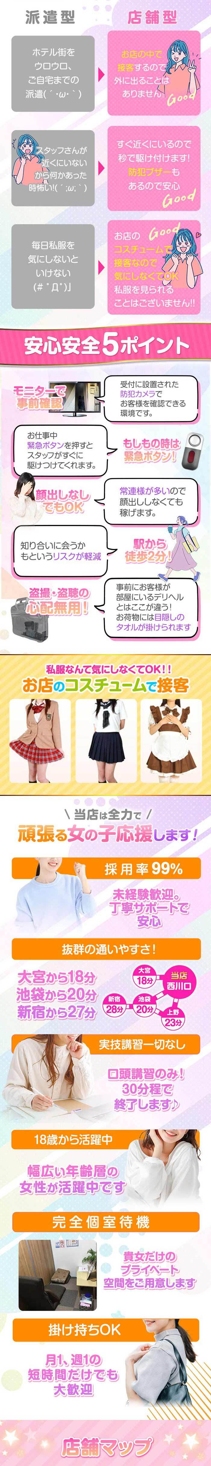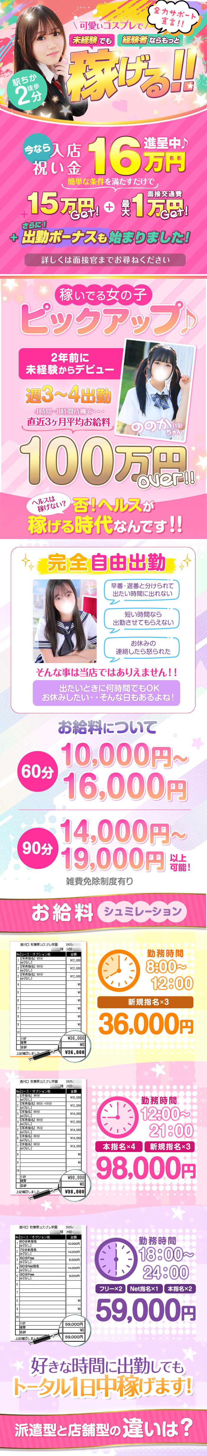 在籍女性の8割が未経験からデビューしている働きやすさ抜群の店舗型ヘルスです! 綺麗なお部屋で可愛いコスチュームを着て接客できます♪ 個室待機・寮・アリバイ対策・写真修正・エステなど、30以上の嬉しい待遇が盛りだくさん!