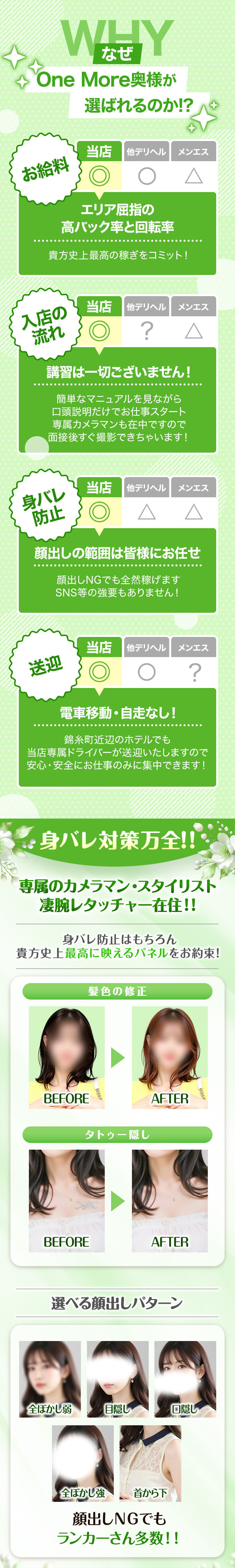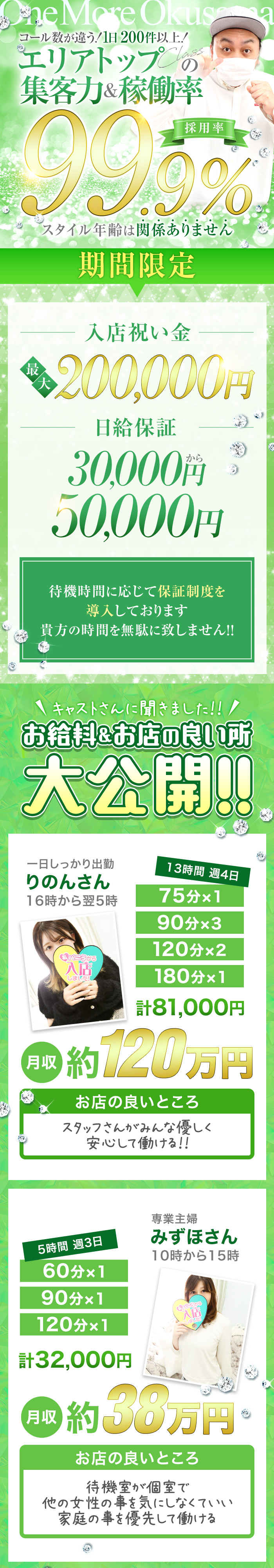 ワンモア奥様期間限定スペシャルイベント 今だけ【フルバック】♪ お客様から頂いたコース料金がすべてお給料に♪ 体験入店、入店していただけるだけで、 誰でも受け取ることのできるイベントです!!! ※面接の際に【フルバック】と面接官にお伝えください。 【女性第一主義】を掲げてる当店だからこそ、 一人一人のキャストに真摯に耳を傾けてご要望に応えてます♪ 当店は経験豊富なベテランスタッフが常に相談に乗れる状態ですので、 何でも相談して下さい、安心してお仕事できると思います^^ 未経験者・経験者問わず大歓迎致します★ ◆出稼ぎさん大歓迎(もちろん保証つき♪) ◆最大バック率は85% ◆寮完備・店泊でもOK ◆雑費ノルマ罰金なし ◆完全個室待機 ◆全額日払い ◆入店祝い金 ◆他店かけもち可 ◆完全自由出勤 ◆未経験者大歓迎 ◆在籍女性が口々にする客層の良さ ◆出退勤時は送迎付きで歩くこと一切なし ◆NGプレイもお聞きします、貴女の出来る事だけで大丈夫です 全スタッフ毎月PCR検査、消毒うがい手洗いの徹底 等、女性の働き易さを重視した環境を用意しております。