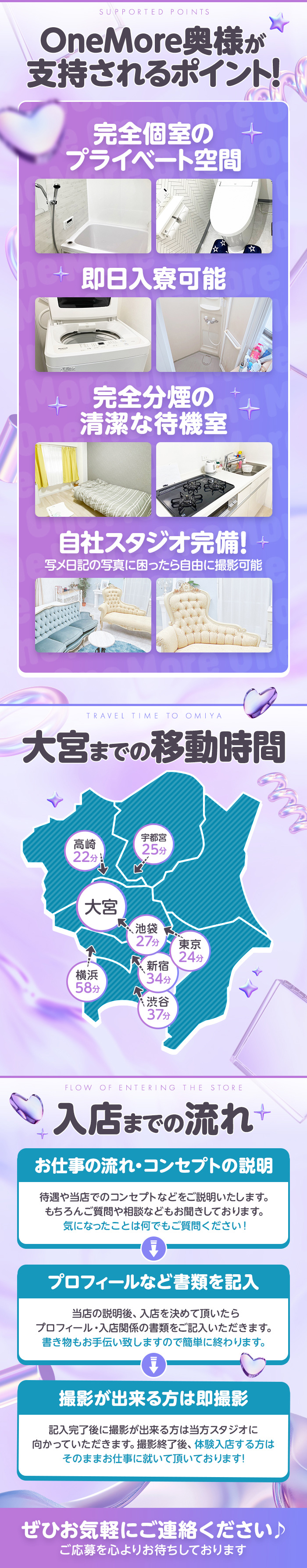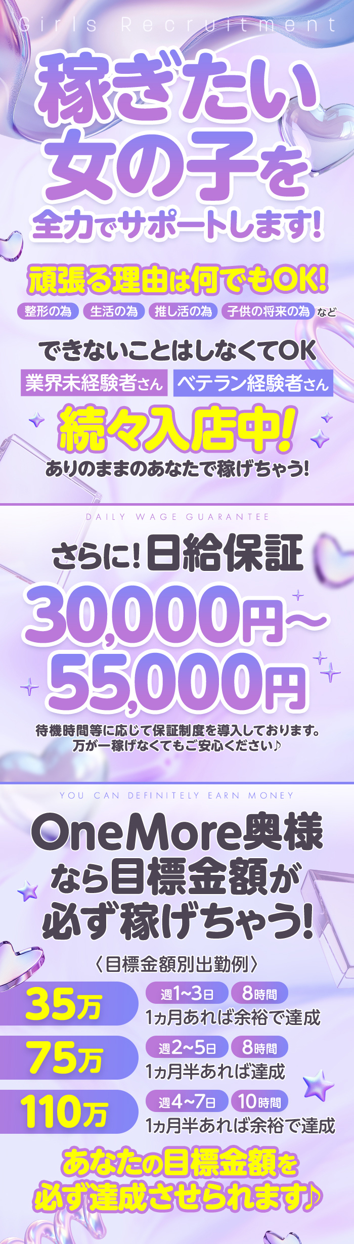 おかげさまでグループ11周年!! 【入店祝金最大10万円】プレゼント!! 当店のコンセプトは【安定】です。 たまに大きく稼げる日があっても月収は大きく上がりません。 OneMore奥様では月収にコミットし、出勤したらいつでも稼げるという環境を意識しております♪ もちろん1日単位でも稼げます!! 【嬉しい給与保証制度有】 30000円~60000円 日給保証制度あり('ω')ノ ☆高バック率&顧客数で集客抜群☆ 完全即日払い・雑費・罰金・ノルマ無しで自由出勤♪ ☆待機室は完全個室☆ 出勤時に一人一人専用の個室待機所をご用意してます(^_-) 自宅待機、ネカフェ待機も可能です! ・分煙対策済み ・防犯セキュリティー ・フリーwifi ・個室マンション寮 ・撮影部屋 分煙・私語厳禁で仮眠もOKです♪ お仕事の合間にしっかり休息を取れます(*´ω`*) ☆18歳から40代まで大歓迎☆ ぽっちゃりさんでも熟女さんでも稼げるお店です☆ タトゥー・妊娠線・傷跡なども心配ありません♪ 当店が急成長できた理由は女性第一という方針で運営してきた結果だと自負しております♪ 即日面接、即日体験入店もOK♪見学だけでも大歓迎です♪
