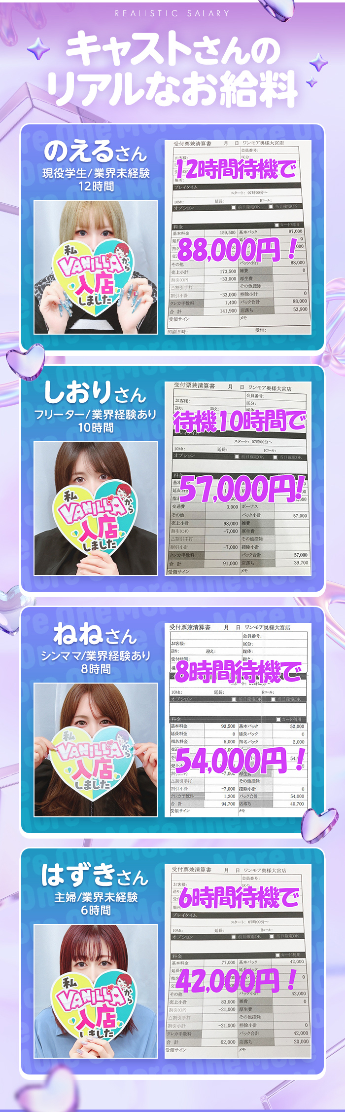 入店歴 3カ月 勤務時間 週3日で12時間待機 月収 110万円以上 目標 推し活のために稼ぎたい 入店歴 1年くらい 勤務時間 10時~18時 月収 65万円以上 目標 お金に困らないこと 入店歴 1年5カ月 勤務時間 10時~16時 月収 50万円以上 目標 子供の将来の為の貯金 入店歴 1年8カ月 勤務時間 7時間 月収 90万円以上 目標 貯金1000万くらい 入店歴 3カ月 勤務時間 12時間 月収 150万円以上 目標 200万以上 入店歴 6か月くらい 勤務時間 10時~16時 月収 40万円以上 目標 子供の為に貯金 入店歴 1年3カ月 勤務時間 10時~21時 月収 80万円以上 目標 毎月100万稼ぎたい 入店歴 5カ月 勤務時間 13時~20時 月収 35万円以上 目標 400万貯金する! 入店歴 1か月 勤務時間 9時間 初日の給与 8時間勤務で