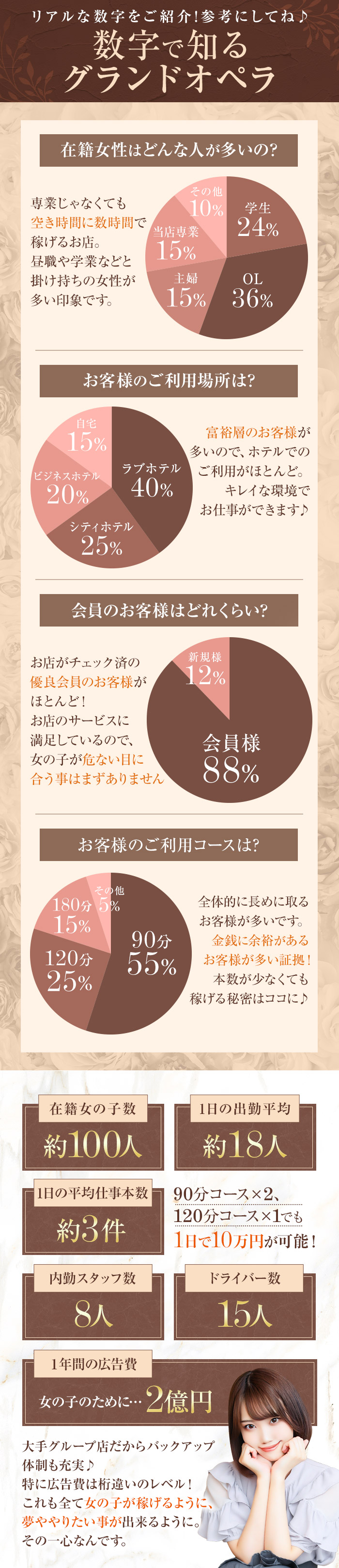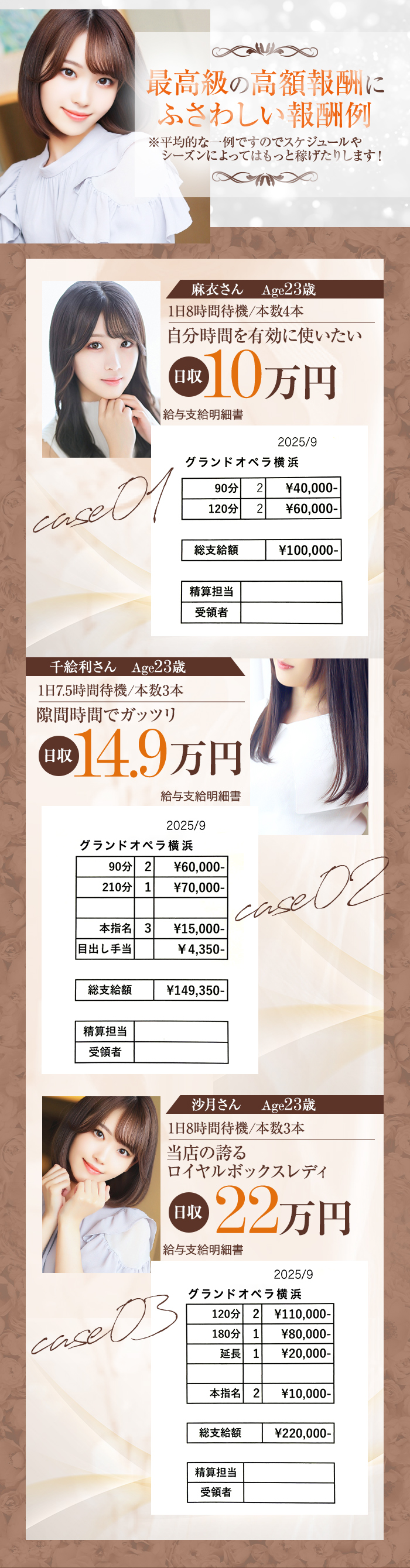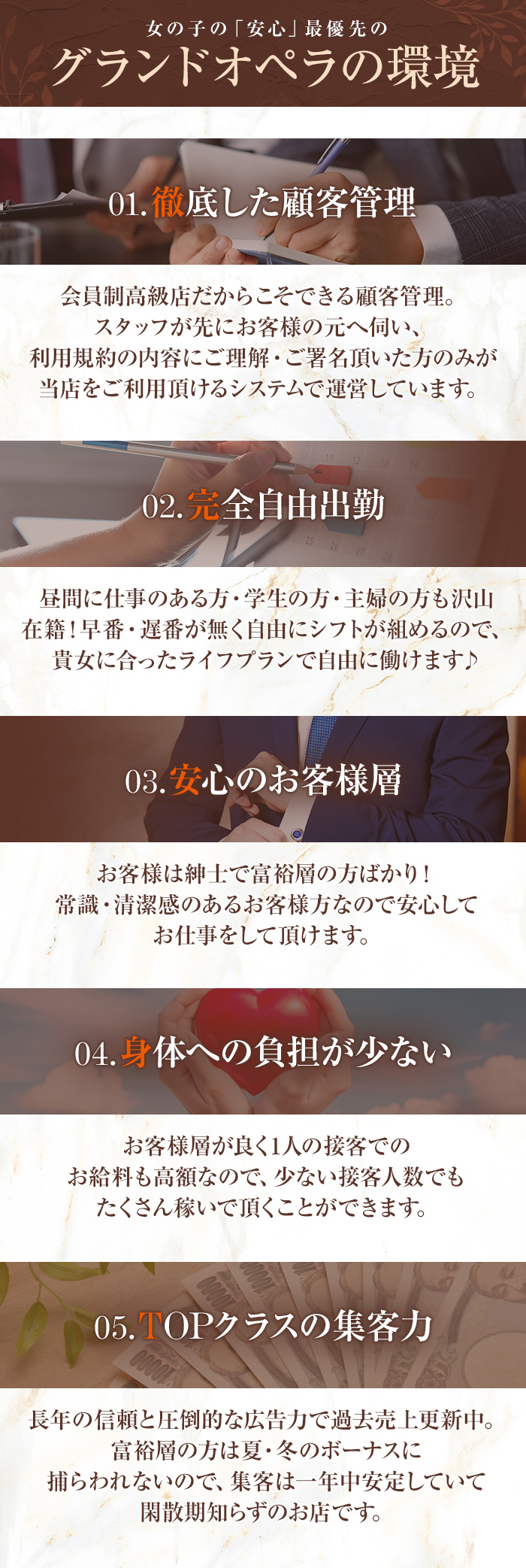 当店グランドオペラ横浜は現状より稼ぎたい!自分の可能性を広げたい!働きやすい環境を求めている!etc向上心があり、謙虚で感謝の気持ちをもってお仕事できる女性を求めています。高級店だから無理などと思っていらっしゃる方や容姿的に自身がないと感じられている方連絡ください。可能性は無限です。自分を変える一歩を踏み出してください!真摯に向き合いお話させていただきます。どうぞよろしくお願いいたします。